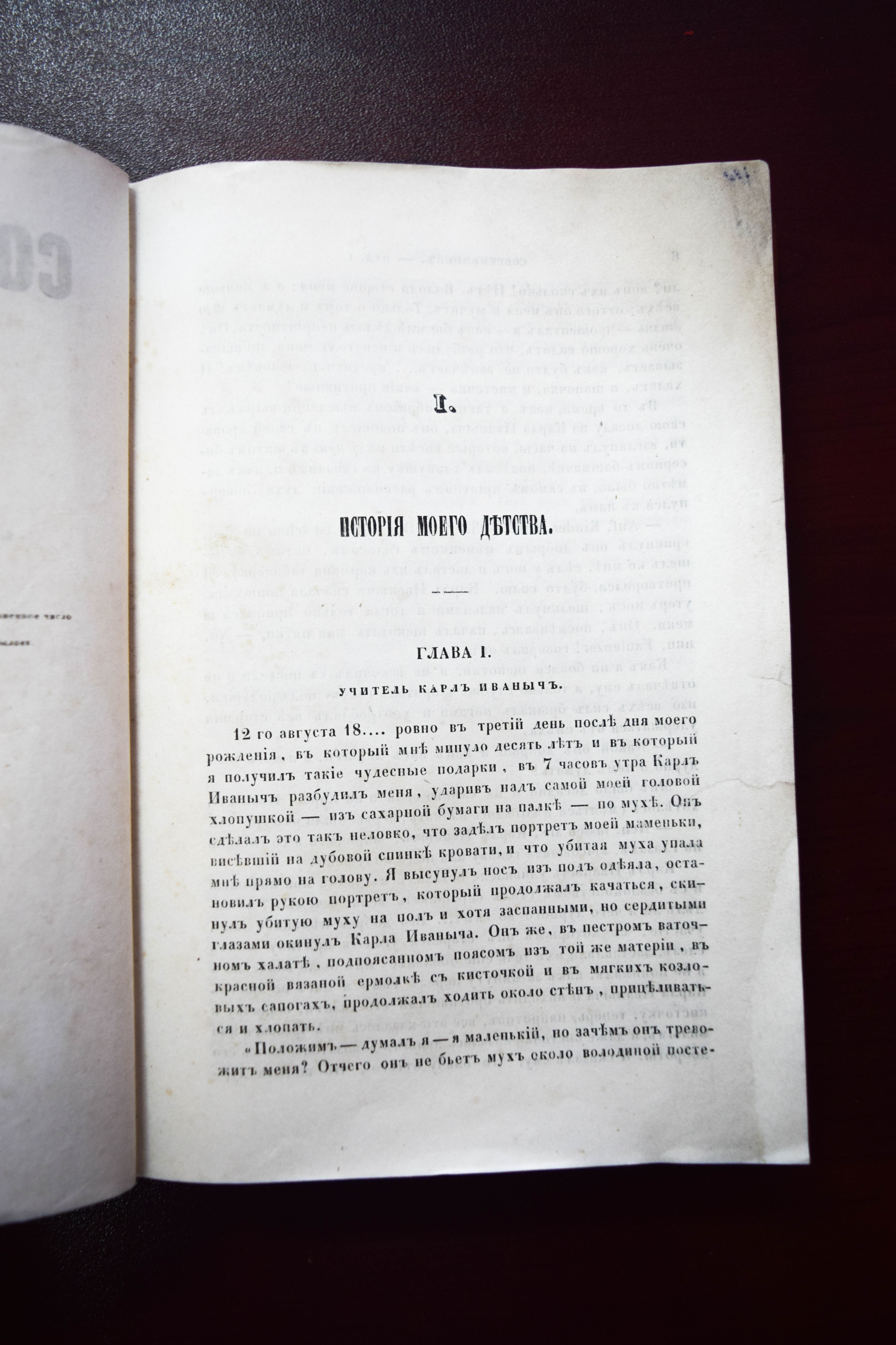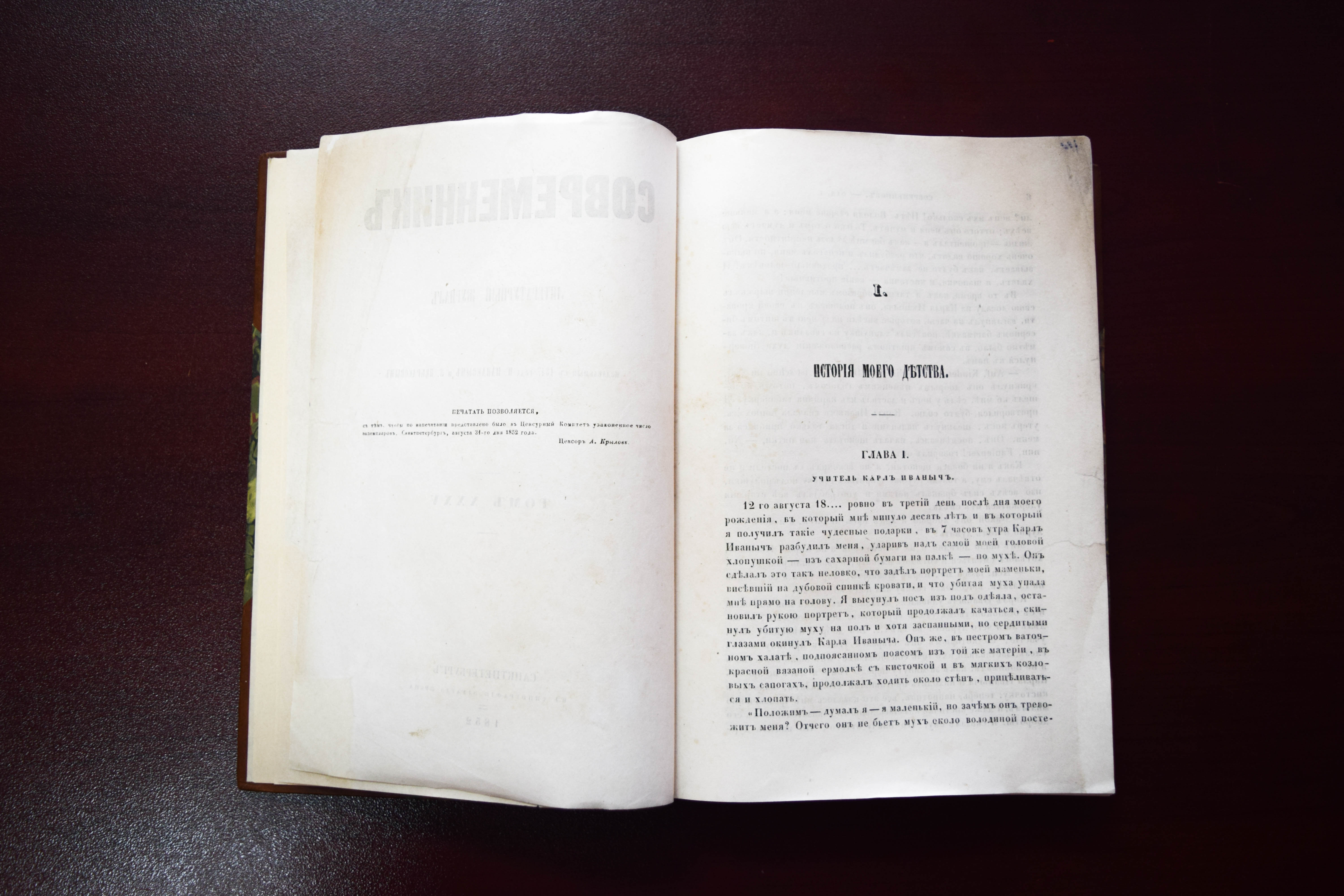«Детство» является первым опубликованным художественным произведением Льва Николаевича Толстого. Первая повесть знаменитой трилогии «Детство», «Отрочество», «Юность» была напечатана в девятом номере самого влиятельного на тот момент литературного журнала «Современник» в 1852 году. Читатели могут познакомиться с этим выпуском в Тульской областной научной библиотеке. В фонде сектора редкой книги хранится отреставрированное в Центре консервации и реставрации документов ВГБИЛ имени М. И. Рудомино издание.