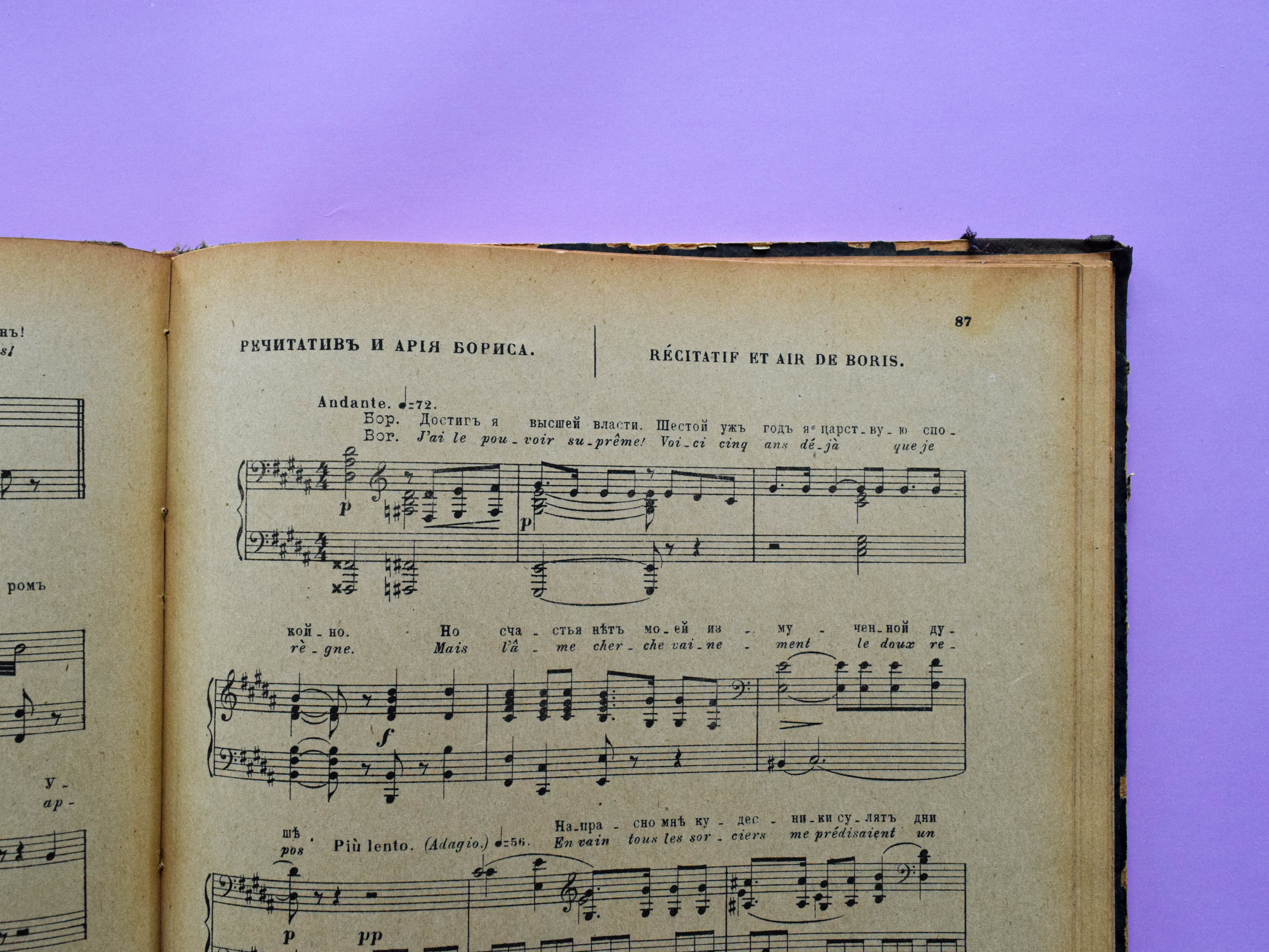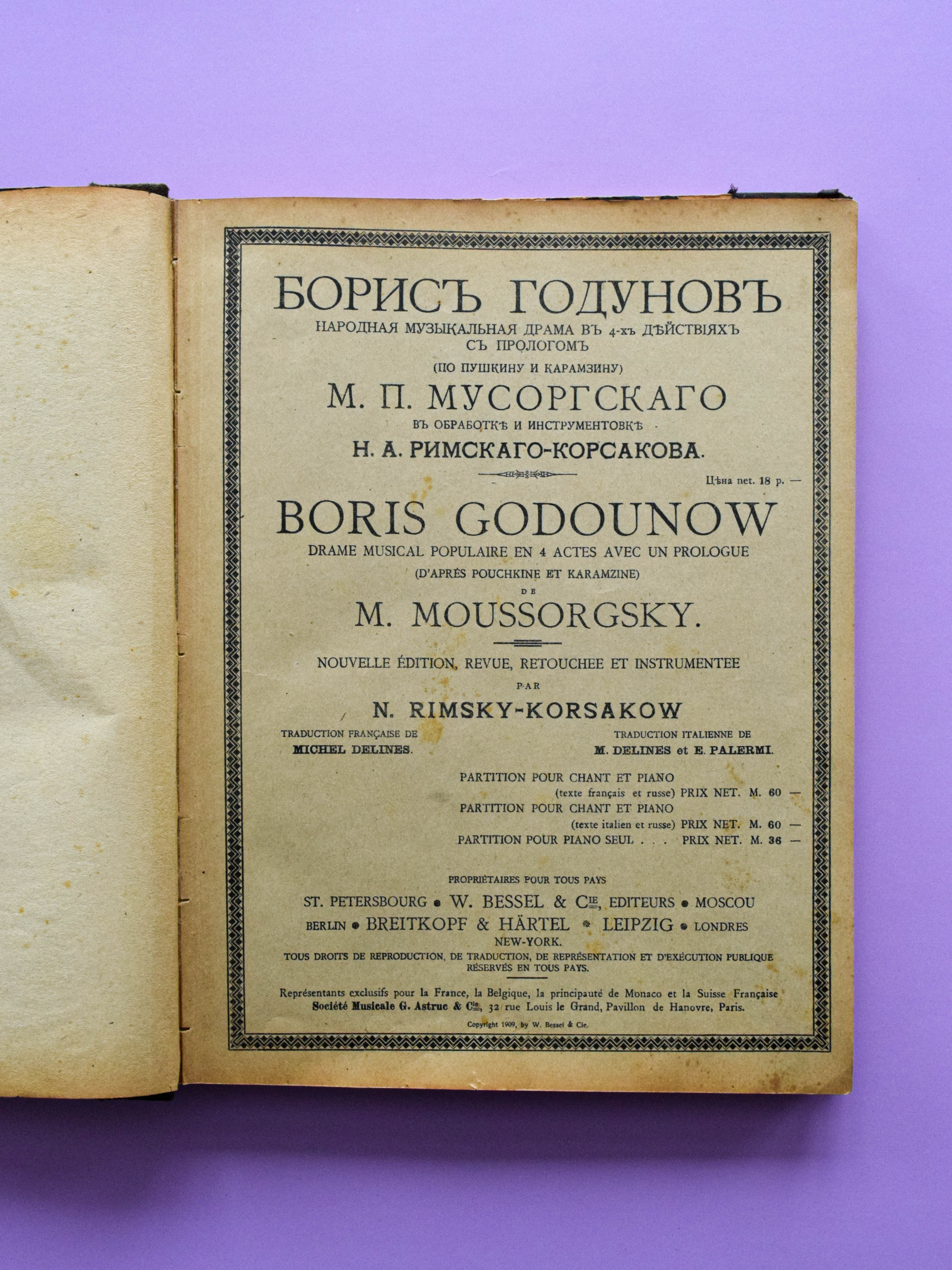 Среди богатого выбора нотных изданий и уникальной печатной продукции издательством «В. Бессель и К̊» была представлена партитура оперы «Борис Годунов» в четырех действиях с прологом Модеста Петровича Мусоргского. Либретто, основанное на одноименной трагедии А. С. Пушкина и материалах «Истории государства Российского» Н. М. Карамзина, было написано самим М. П. Мусоргским.