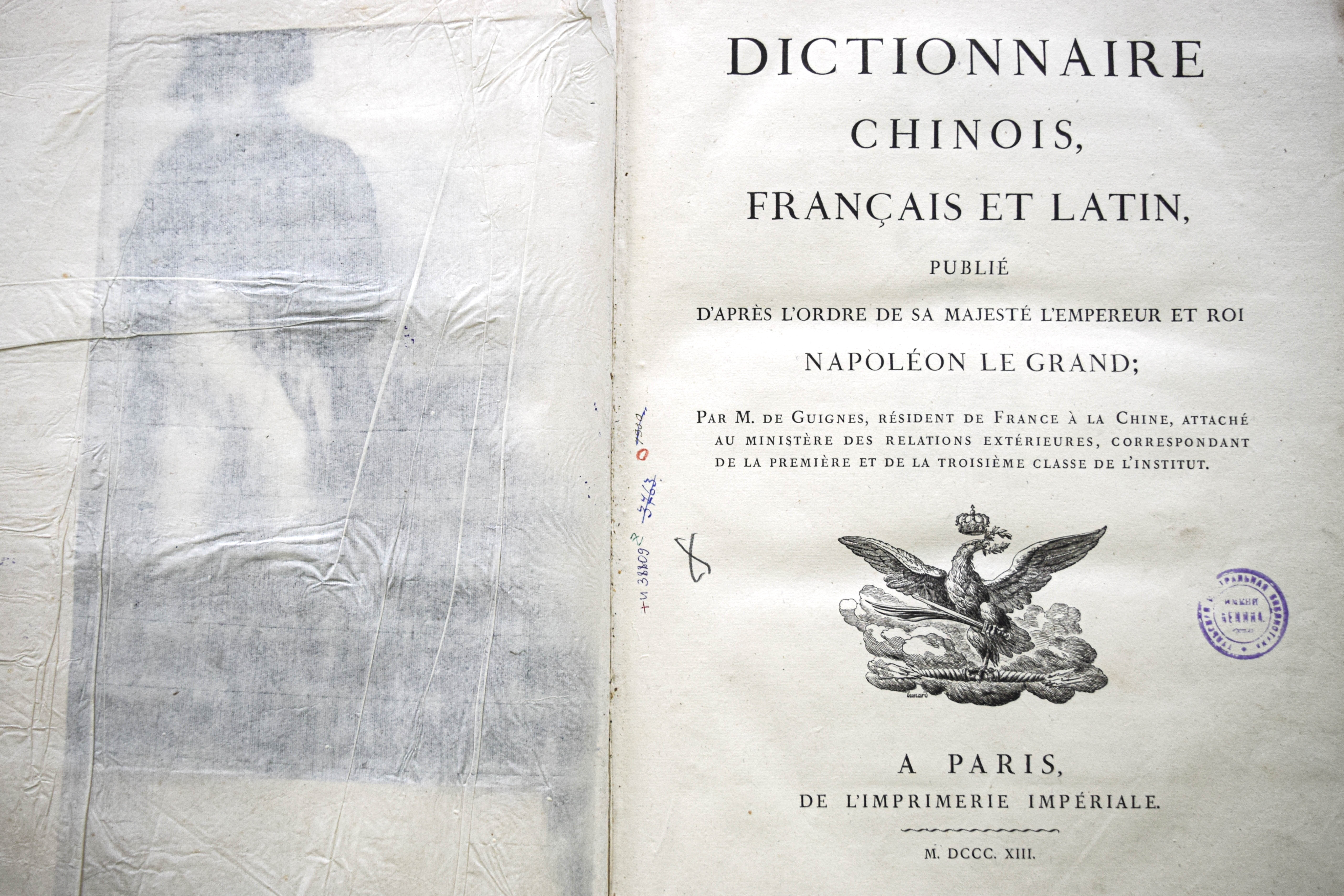 Редким оригинальным изданием первого китайского словаря, опубликованного во Франции, является книга Guignes, Ch.-L.-J. de. Dictionnaire chinois, français et latin, publie d'apres l'ordre de sa majeste l'Empereur et Roi Napoleon Le Grand / par M. de Guignes… (Paris, 1813). Словарь подготовил Кретьен-Луи де Гинь (Chrétien-Louis de Guignes;1759-1845) – сын известного востоковеда и синолога Жозефа де Гиня, французский атташе консульства в Кантоне, проживавший в Китае на протяжении семнадцати лет.