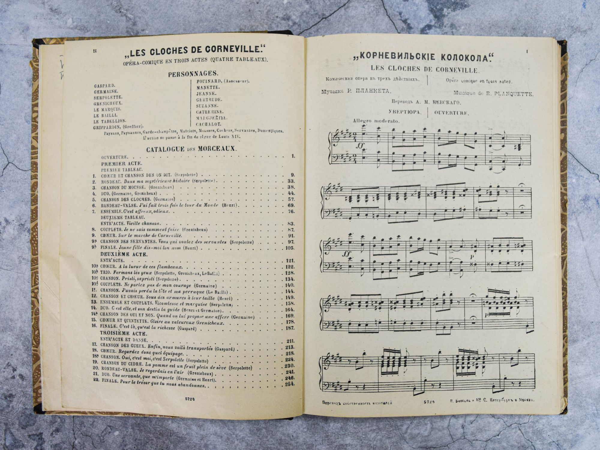 Среди богатого выбора нотных изданий и уникальной печатной продукции издательством «В. Бессель и Ко» была представлена комическая опера Робера Планкета «Корневильские колокола» в трех действиях, с переводом Александра Максимовича Невского (1842-1904) на французский язык.