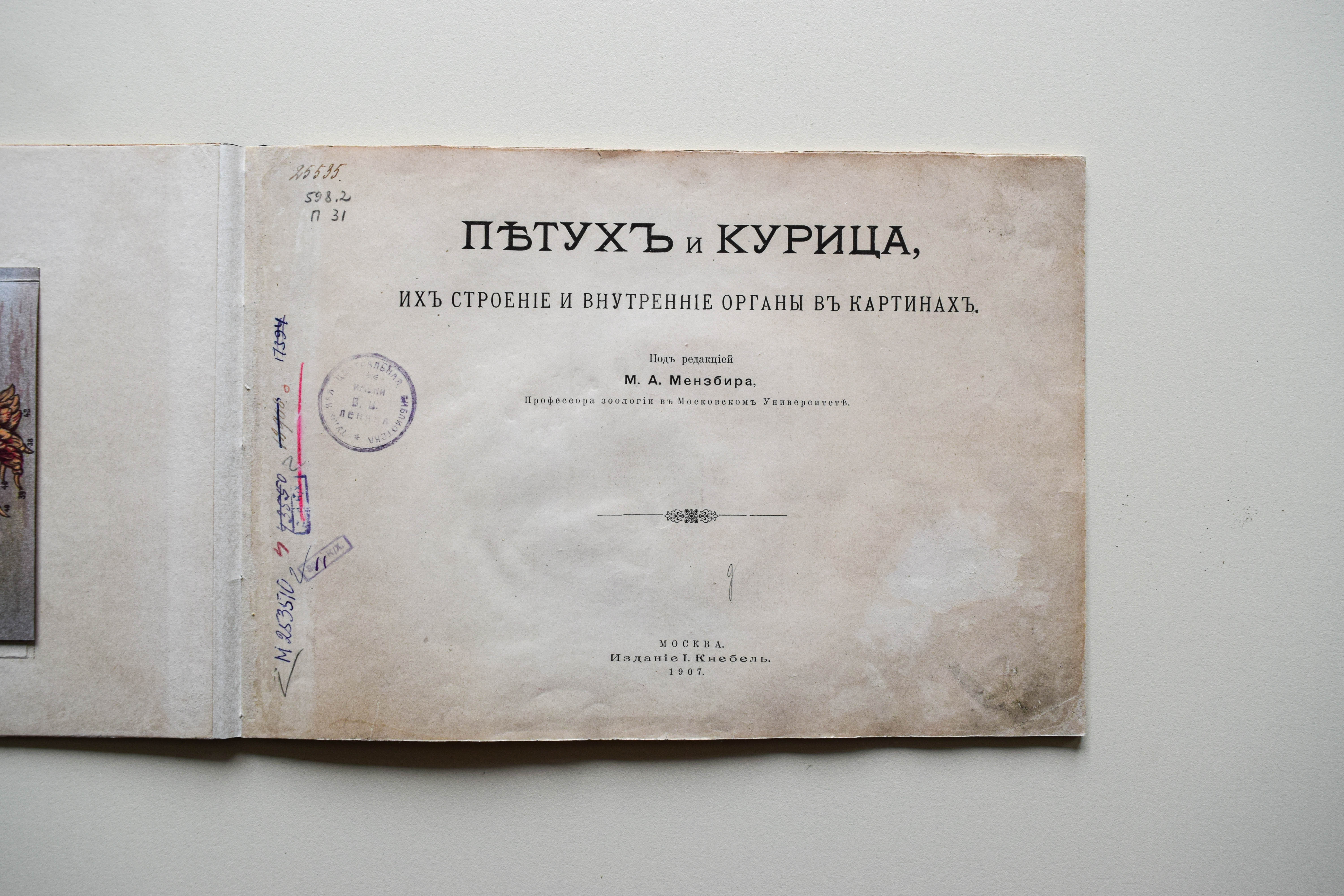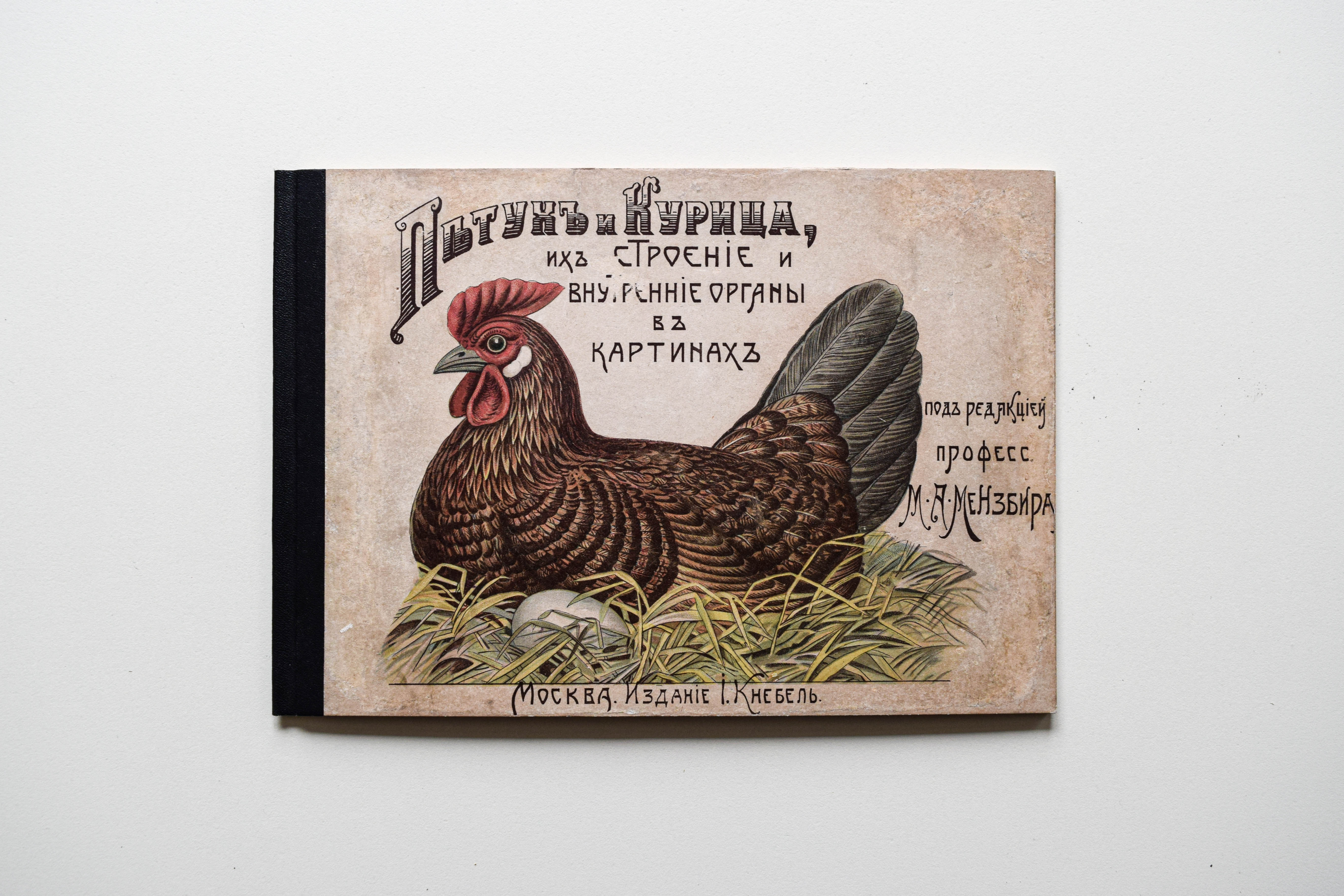 Большое внимание Мензбир уделял изданию и переизданию учебников и лекций по зоологии. Одним из таких учебных пособий стала книга «Петух и курица, их строение и внутренние органы в картинках», выпущенная в 1907 году в Москве в издательстве И. Кнебеля. Все выходные данные книги указаны на титульном листе. Они дублируются также на обложке, которая представляет собой издательский иллюстрированный картонажный переплёт с изображением курицы. Книга построена на преобладании визуального материала над текстовым, т.к. содержит раскладные модели петуха и курицы с цветными вклейками-схемами на форзаце и нахзаце. Листовой блок состоит из четырех страниц с объяснениями раскладных моделей птиц.