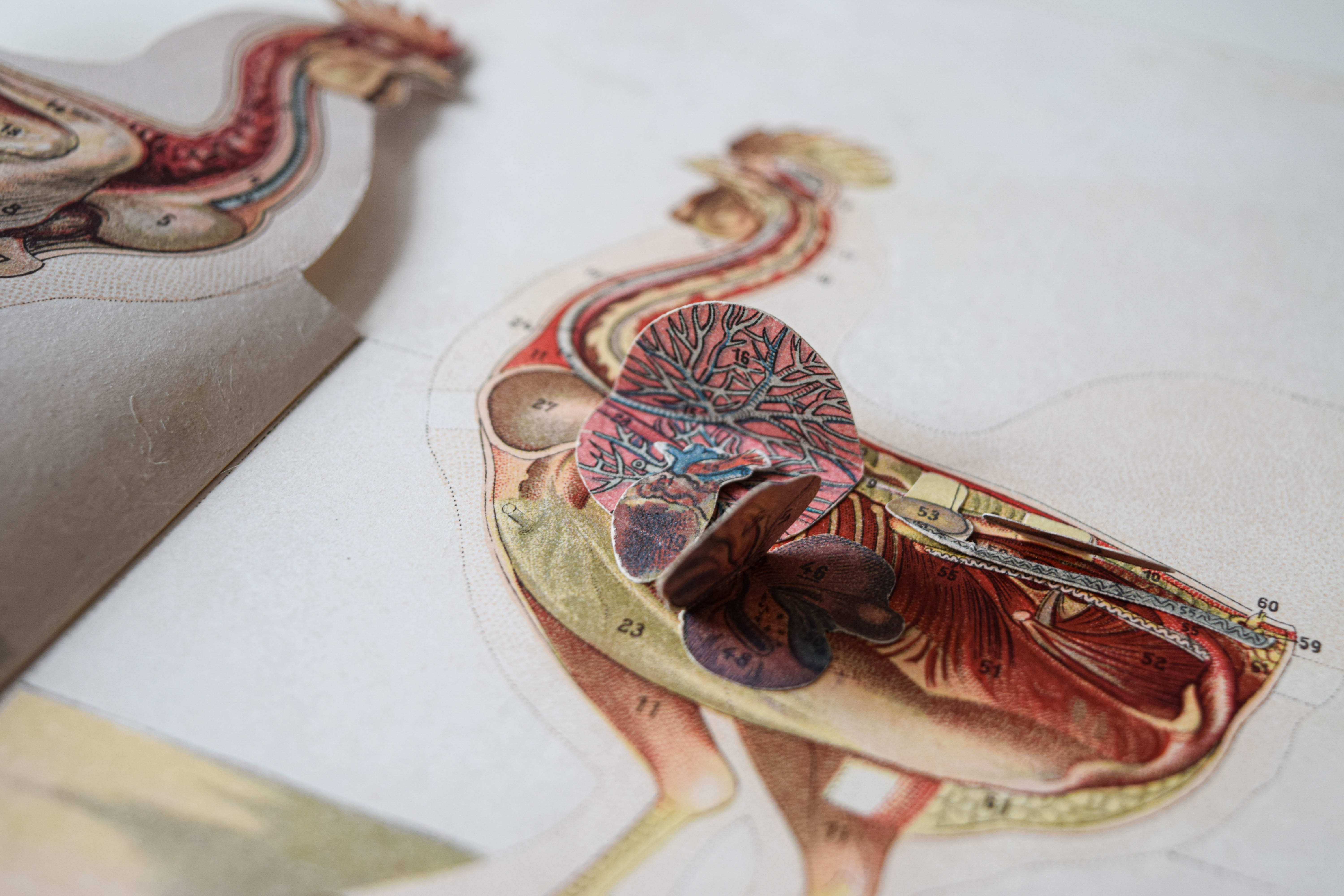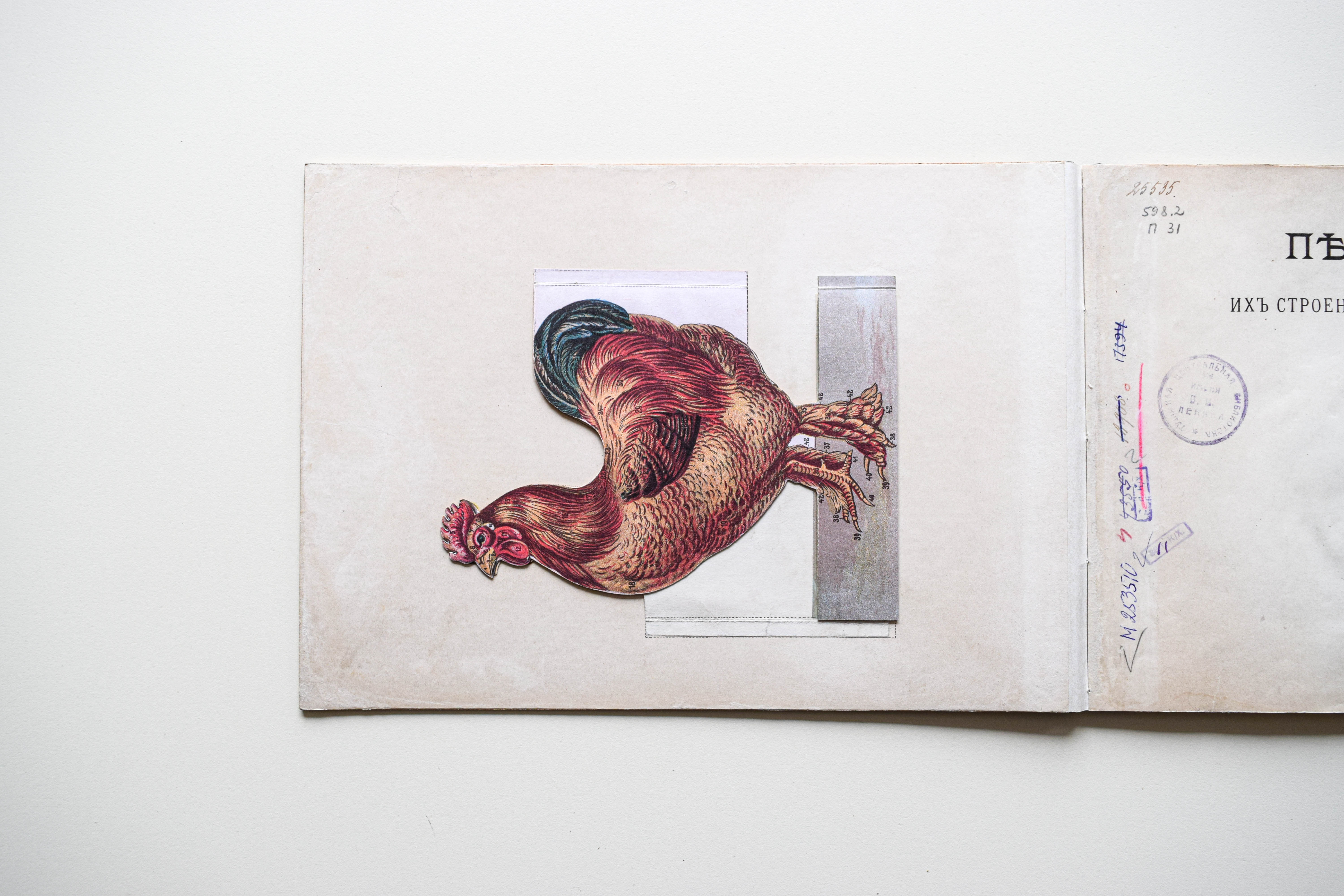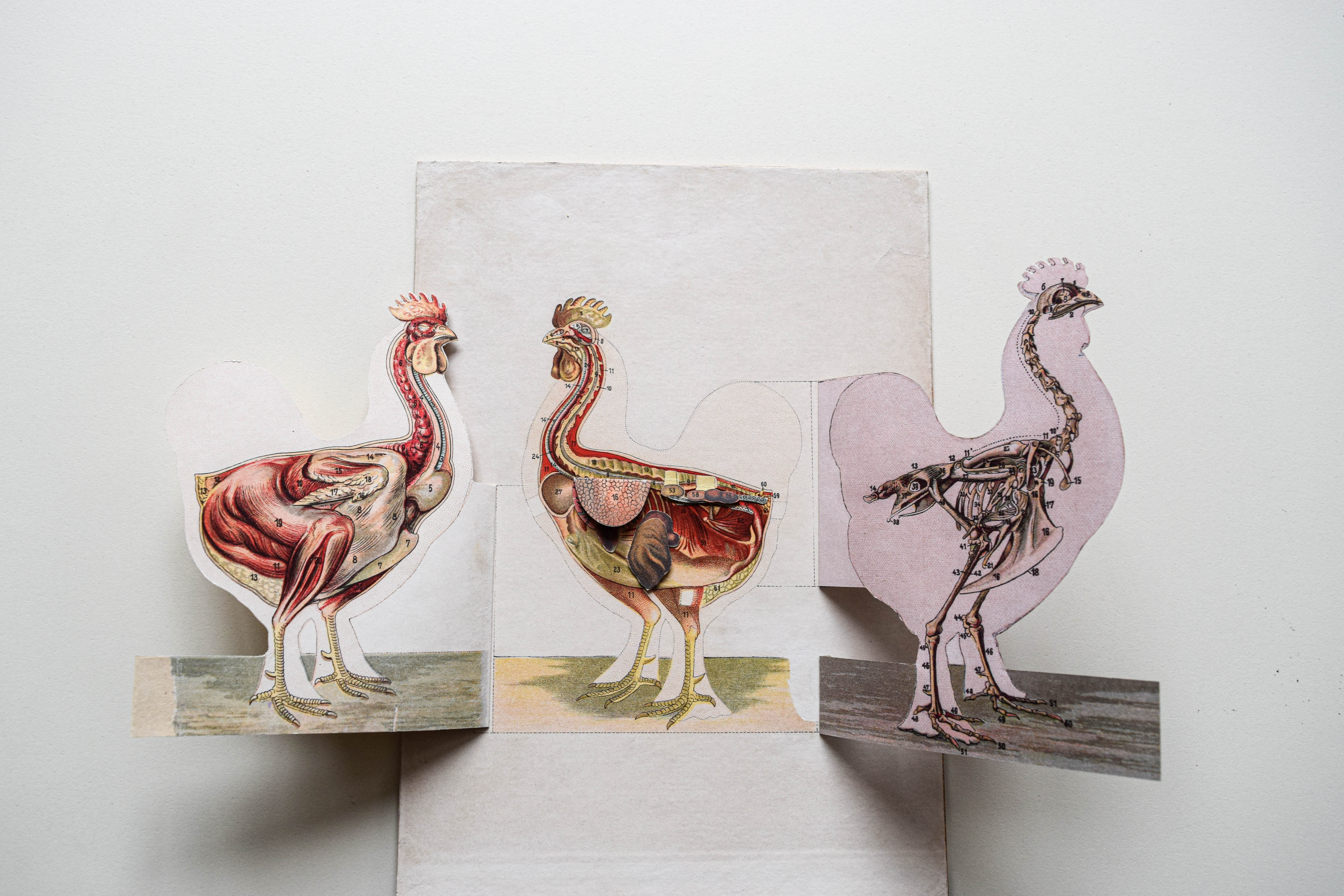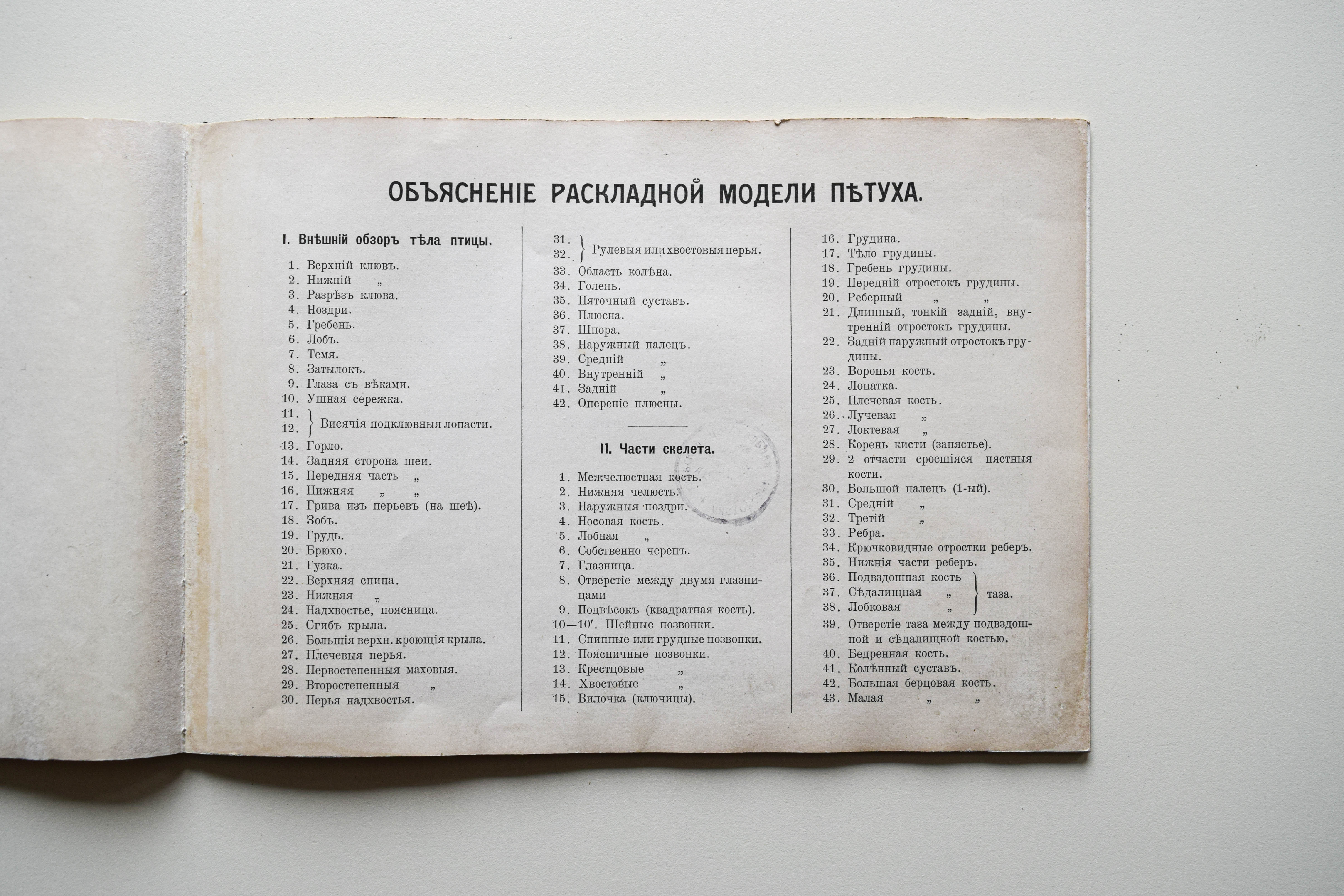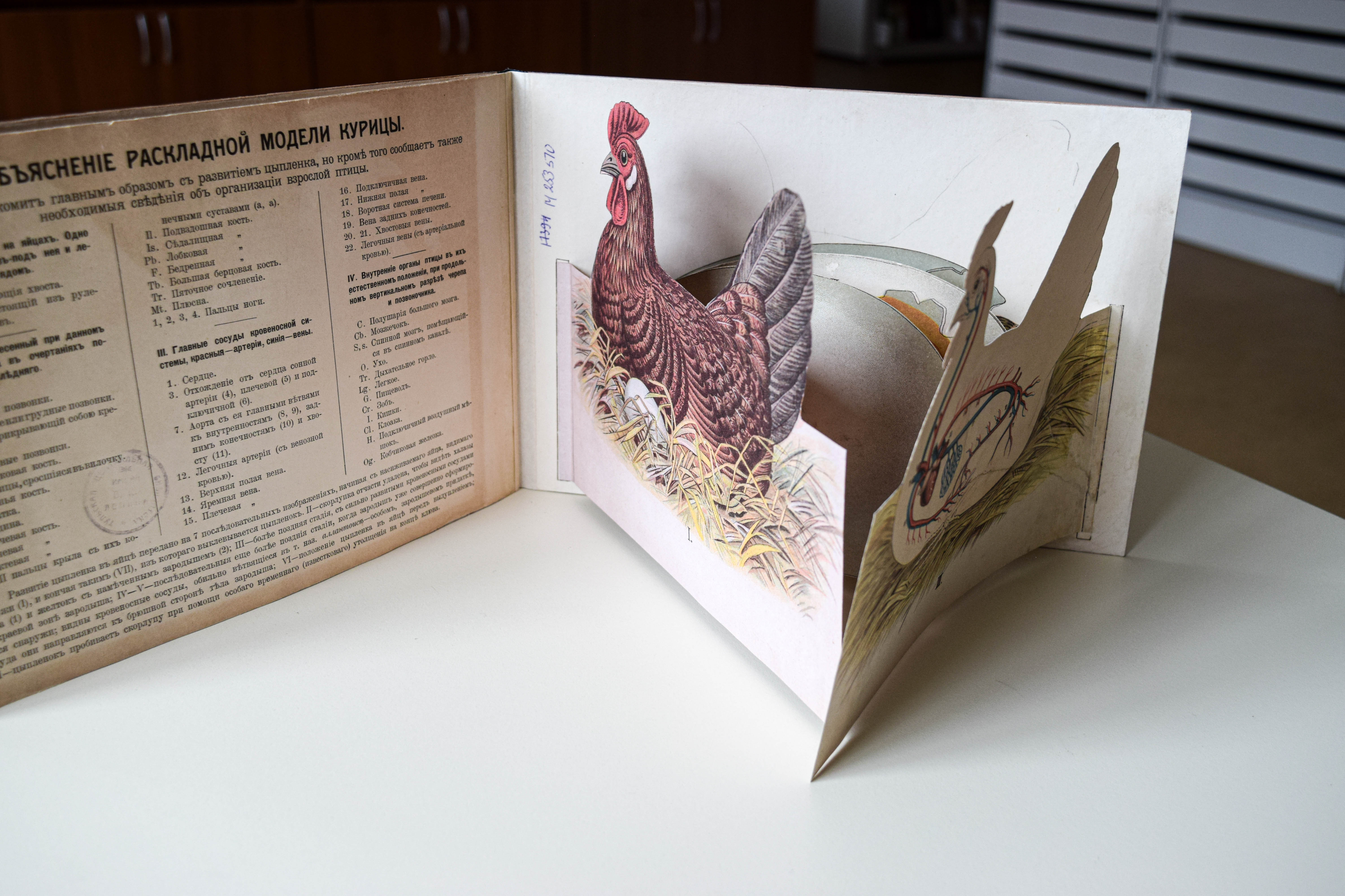 Раскладная модель петуха, представленная на форзаце книги, показывает внешний обзор тела птицы, части скелета, внешний обзор тела птицы после удаления перьев, наиболее важные мышцы и внутренние органы птицы. Каждая из схем модели детально прорисована и пронумерована, а на последней (внутренние органы) имеются дополнительные миниатюрные и раскладные вклейки-схемы внутренних органов, которые отмечены цифрами. Внутри книги находятся объяснения раскладной модели петуха. За каждой цифрой в каждом текстовом блоке указан соответствующий ей орган или часть тела птицы, например, в разделе II «Части скелета» за цифрой 23 указана воронья кость, а в разделе V «Внутренние органы птицы» за цифрой 19 — сердце и т.д.