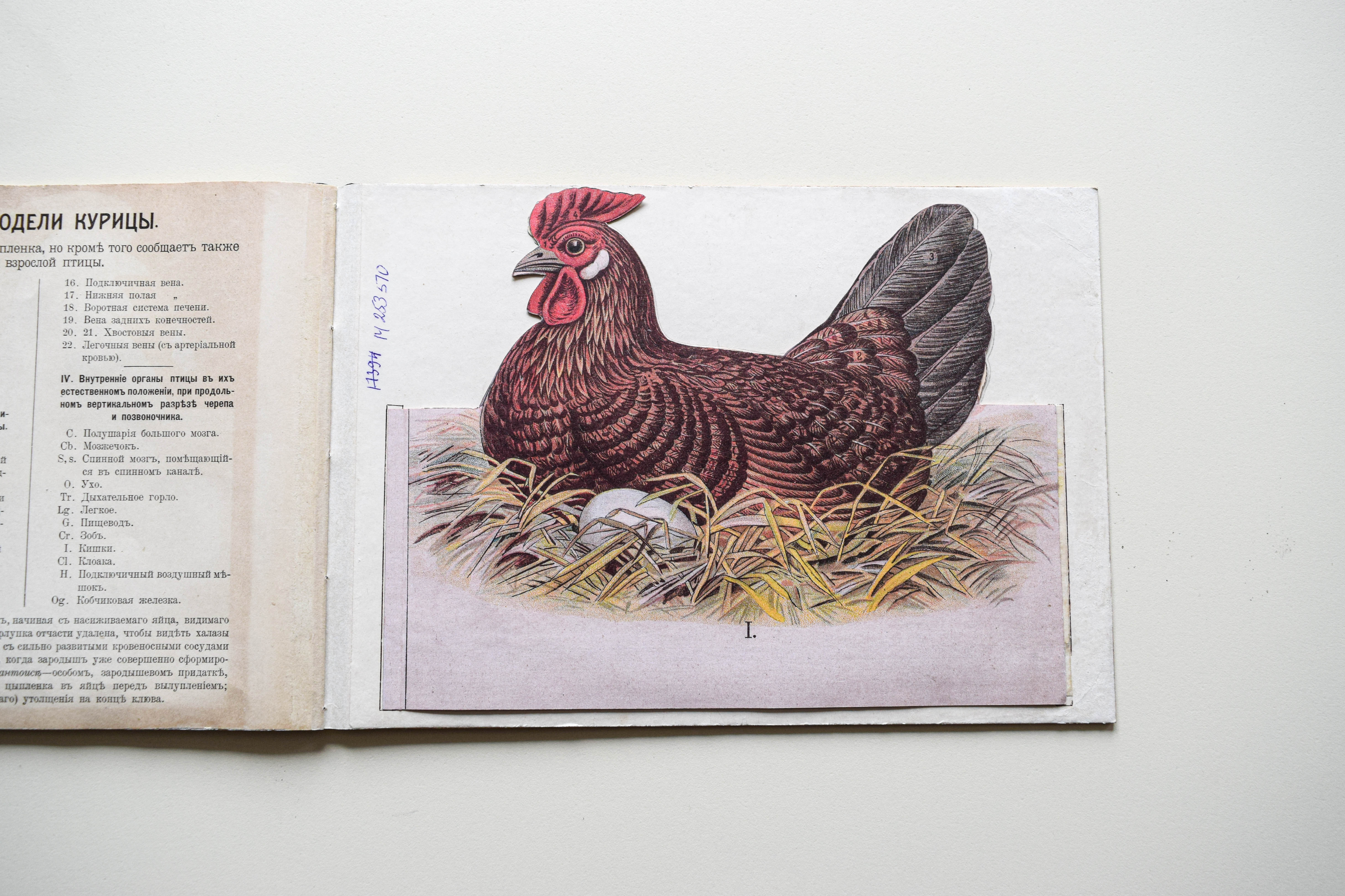 На нахзаце находится раскладная модель курицы. Эта модель, как пишет сам Михаил Александрович Мензбир в книге, знакомит главным образом с развитием цыплёнка, но кроме того сообщает также необходимые сведения об организации взрослой птицы, ее кровеносной и мышечной систем, скелета. Детали модели также подробно пронумерованы и описаны («Курица, сидящая на яйцахъ. Одно яйцо выкатилось изъ-подъ нея и лежитъ рядомъ. Cv. Верхiя кроющiя хвоста. Т. Хвостъ, состоящiй изъ рулевыхъ перьевъ.»).