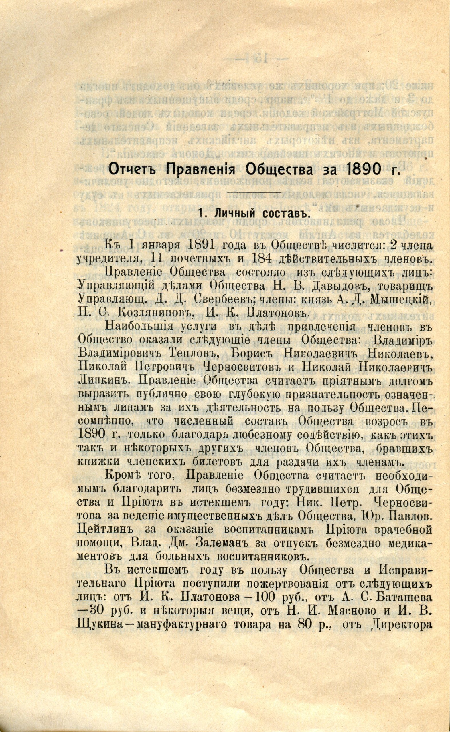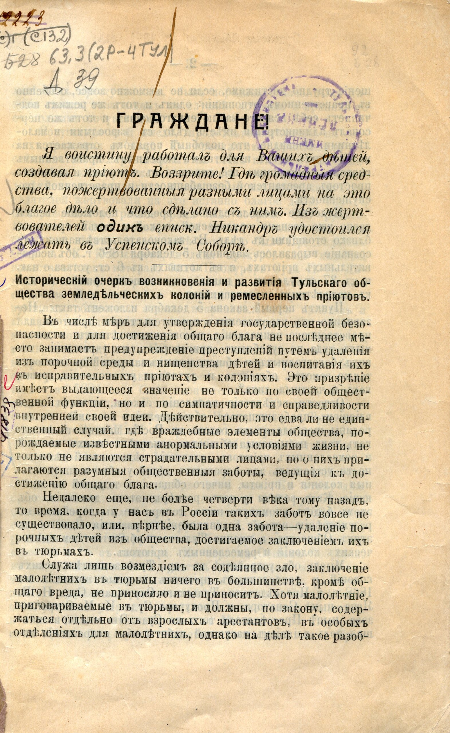 В книге «Деятельность Александра Степановича Баташева по открытию и устройству приюта для малолетних преступников в г. Туле…» первые страницы посвящены историческому очерку возникновения и развития тульского общества земледельческих колоний и ремесленных приютов для несовершеннолетних. Идея создания такого учреждения в Туле зародилась еще в 1868 году, на реализацию ушло более 20 лет. Александр Степанович пожертвовал ради открытия приюта часть своей усадебной земли: «два больших двухэтажных деревянных дома, с усадебными постройками, способных вместить 30-40 детей и две мастерских. К дому принадлежит молодой фруктовый сад, раскинутый на 4-5 десятинах, что дает возможность обучать садоводству и отчасти огородничеству». В 1890 году приют был объявлен открытым для приема воспитанников. Далее приводятся примеры европейского опыта создания подобных заведений, так, например, в Англии возникают оригинальные исправительные школы — корабли, на которых дети, кроме ремесел, обучались еще и морскому делу. За историческим очерком следует отчет правления общества за 1890 год, где опубликованы принятые на заседаниях общества постановления. В конце прилагается опись, где перечислено все движимое и недвижимое имущество приюта. Например, если посмотреть графу «на дворе», то можно узнать, что за приютом числилась корова по кличке Молочко.