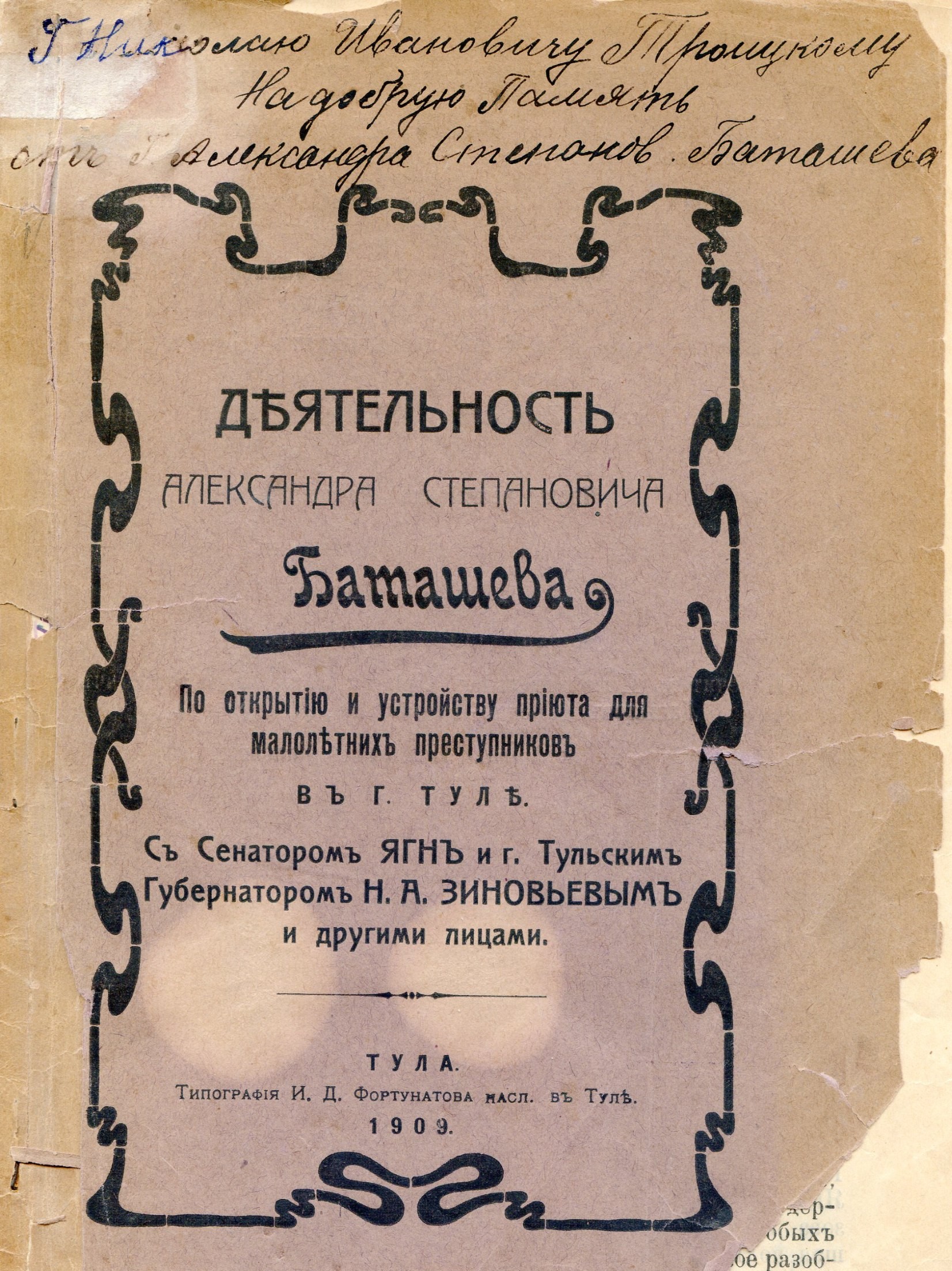 В фонде Тульской областной научной библиотеки хранится любопытное издание, вышедшее в 1909 году, – «Деятельность Александра Степановича Баташева по открытию и устройству приюта для малолетних преступников в г. Туле: с сенатором Ягн и г. Тульским Губернатором Н.А. Зиновьевым и другими лицами». Книга была издана в Туле в типографии И. Д. Фортунатова.
