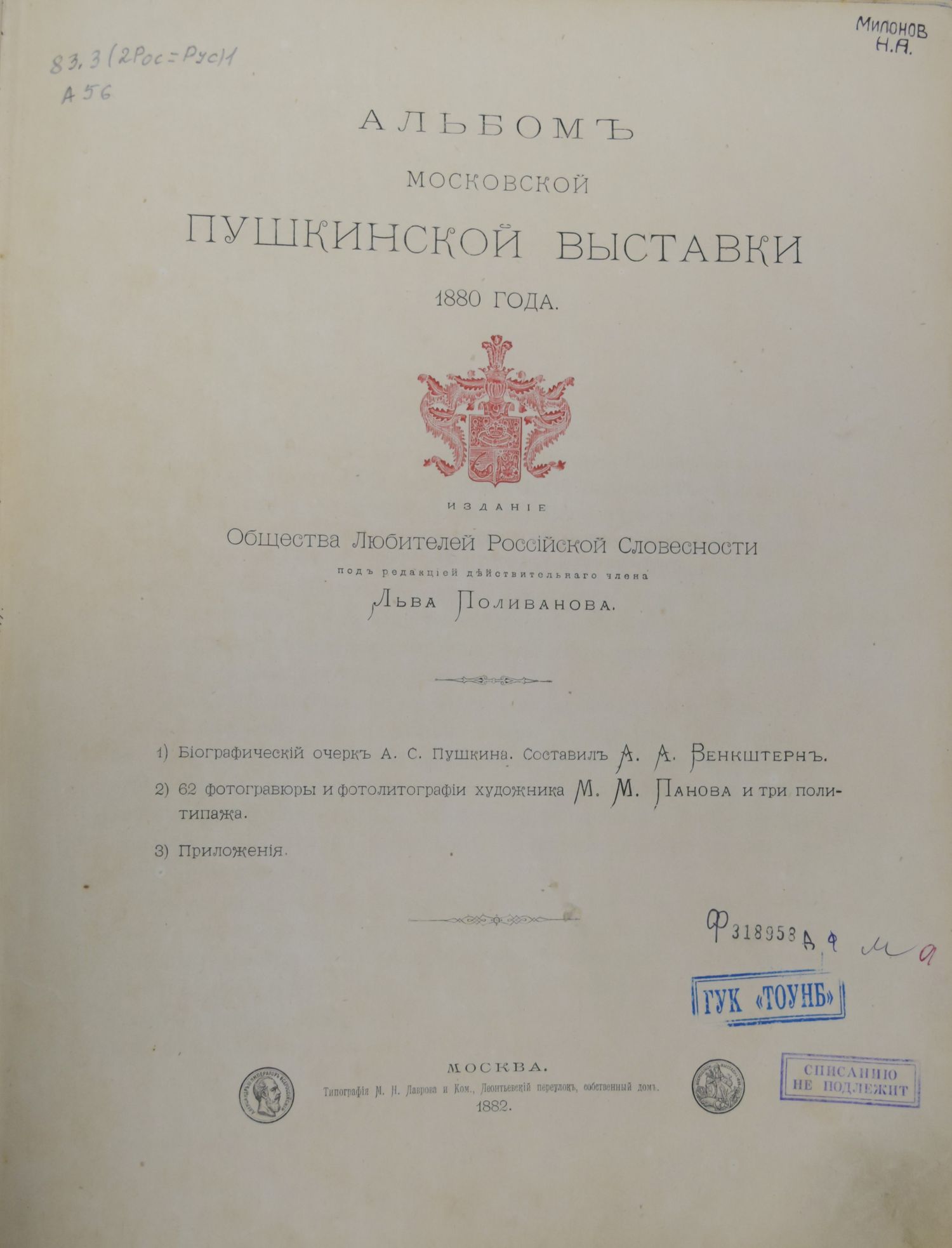В фонде Тульской областной научной библиотеки хранятся два экземпляра издания о выставке. Это – «Альбом Московской Пушкинской выставки 1880 года. Издание Общества любителей российской словесности под редакцией действительного члена Льва Поливанова», напечатанный в 1882 г. и переизданный в 1887 г.