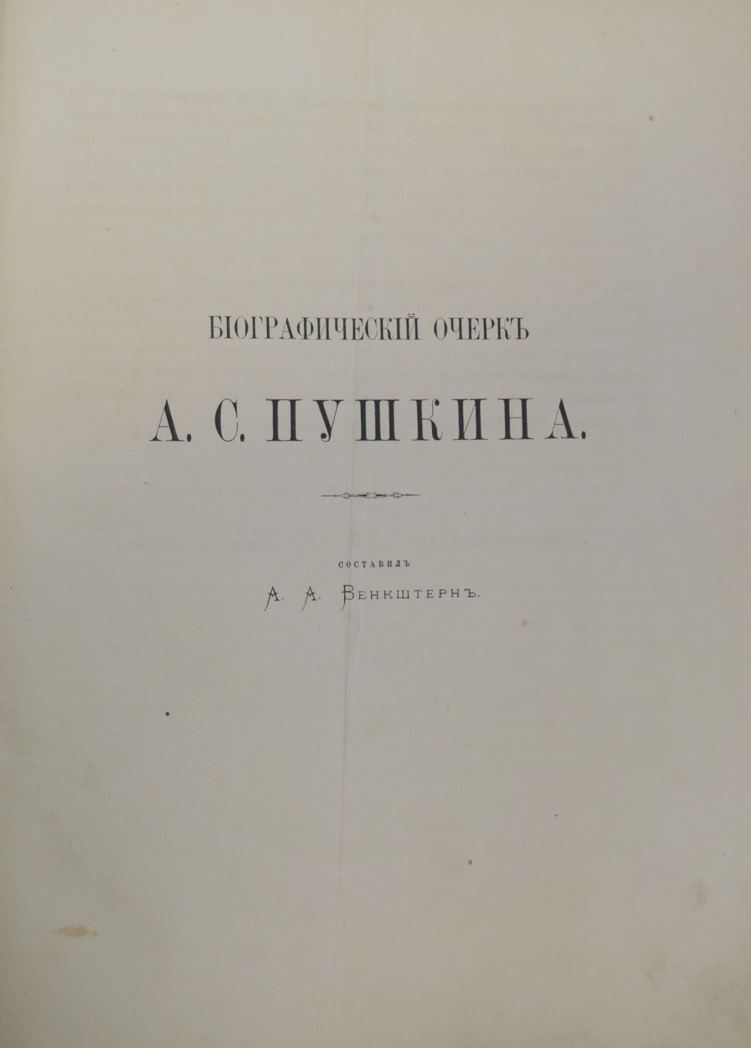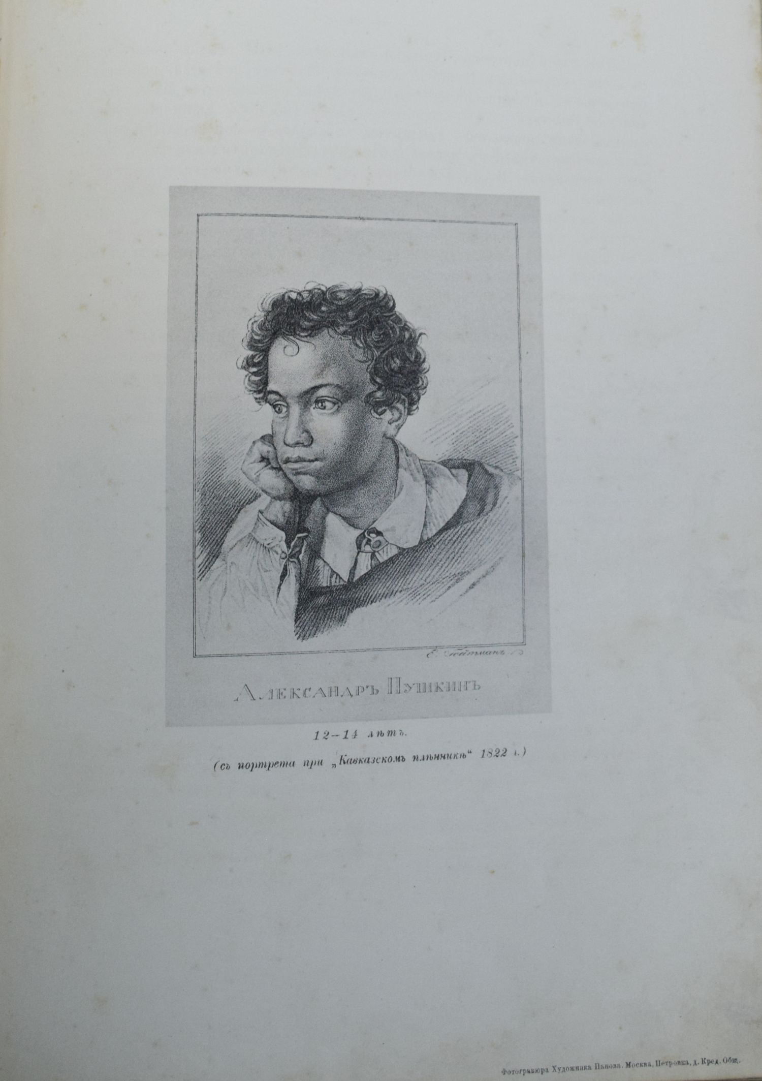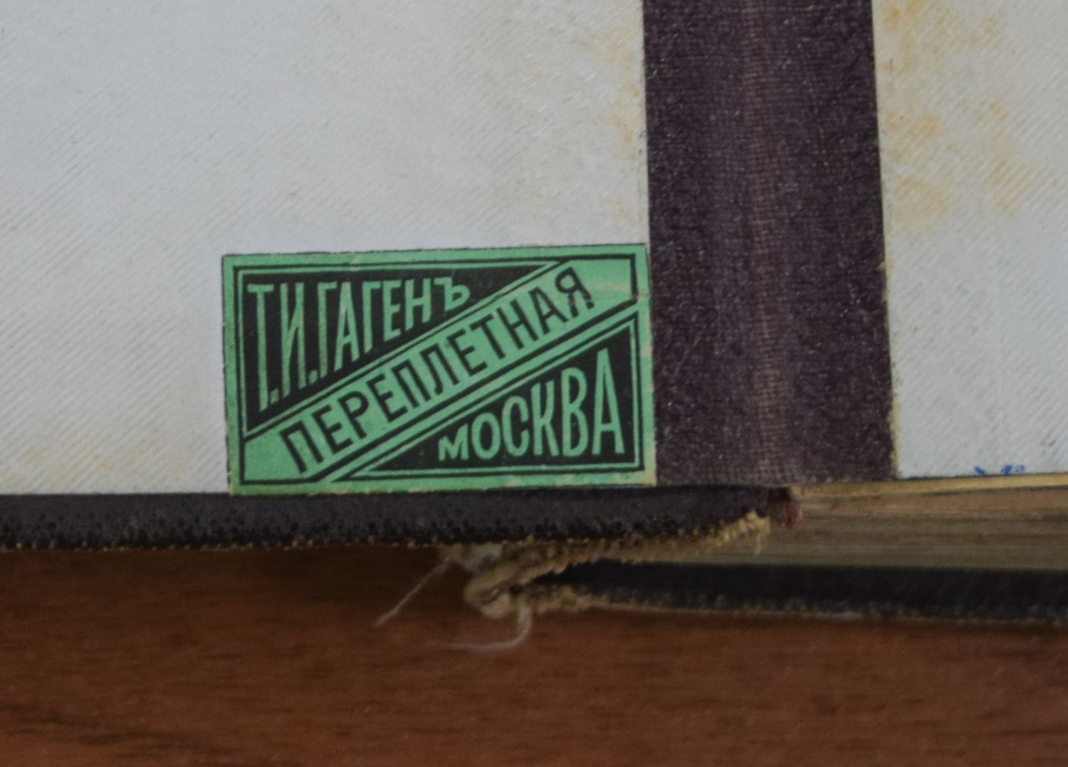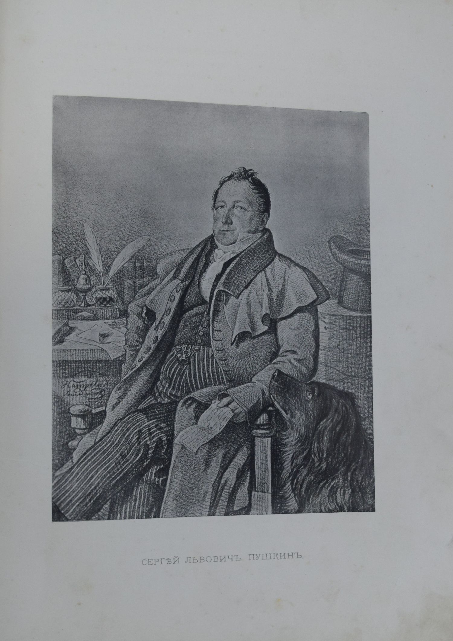 Книга в издательском ледериновом переплете с золотым тиснением на корешке и передней крышке: линейные рамки, название издания, издательство и родовой герб Пушкиных. Тройной тонированный обрез, форзацы оклеены «муаровой» бумагой. Альбом выполнен в мастерской Т. И. Гаген (ярлык на форзаце). [Теофил Иванович Гаген (1831 - 1912 гг.)], потомственный дворянин, был владельцем мастерской (фабричного типа) в Москве, которая существовала с 1868 по 1900 гг., а в начале ХХ в. вошла в «Товарищество Т. И. Гаген».