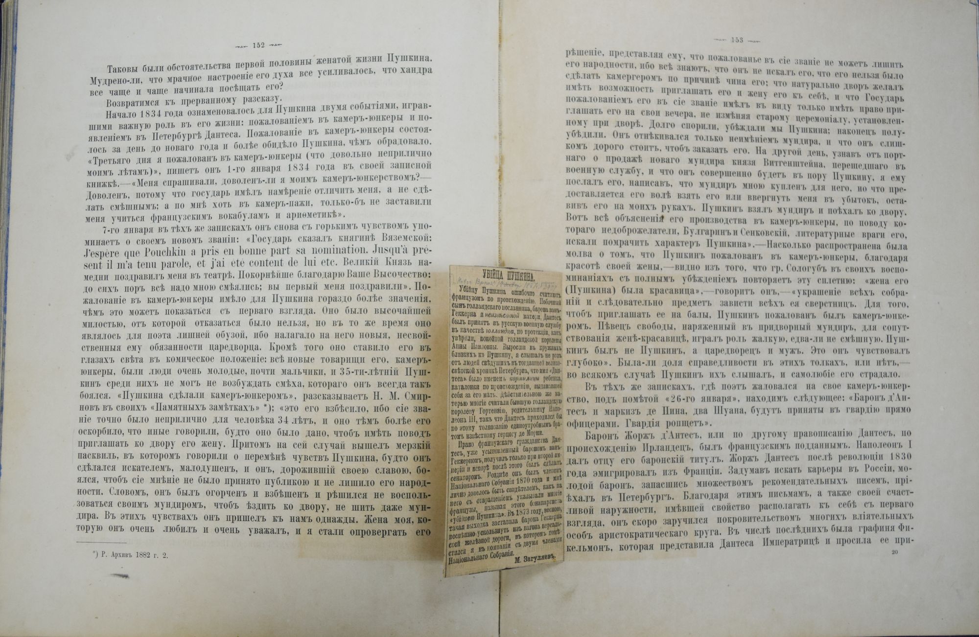 «Альбом Московской Пушкинской выставки» 1882 г. имеет еще одну особенность: на с. 130-131, 152-153, 171 вклеены вырезанные статьи из газеты «Новое время» 1887 г., посвященные А. С. Пушкину. Газета «Новое Время» в течение нескольких десятилетий считалась ведущим ежедневным периодическим изданием дореволюционной России. В 1876 г. её владельцем, заодно и главным редактором, стал выдающийся российский публицист и литератор Алексей Сергеевич Суворин.