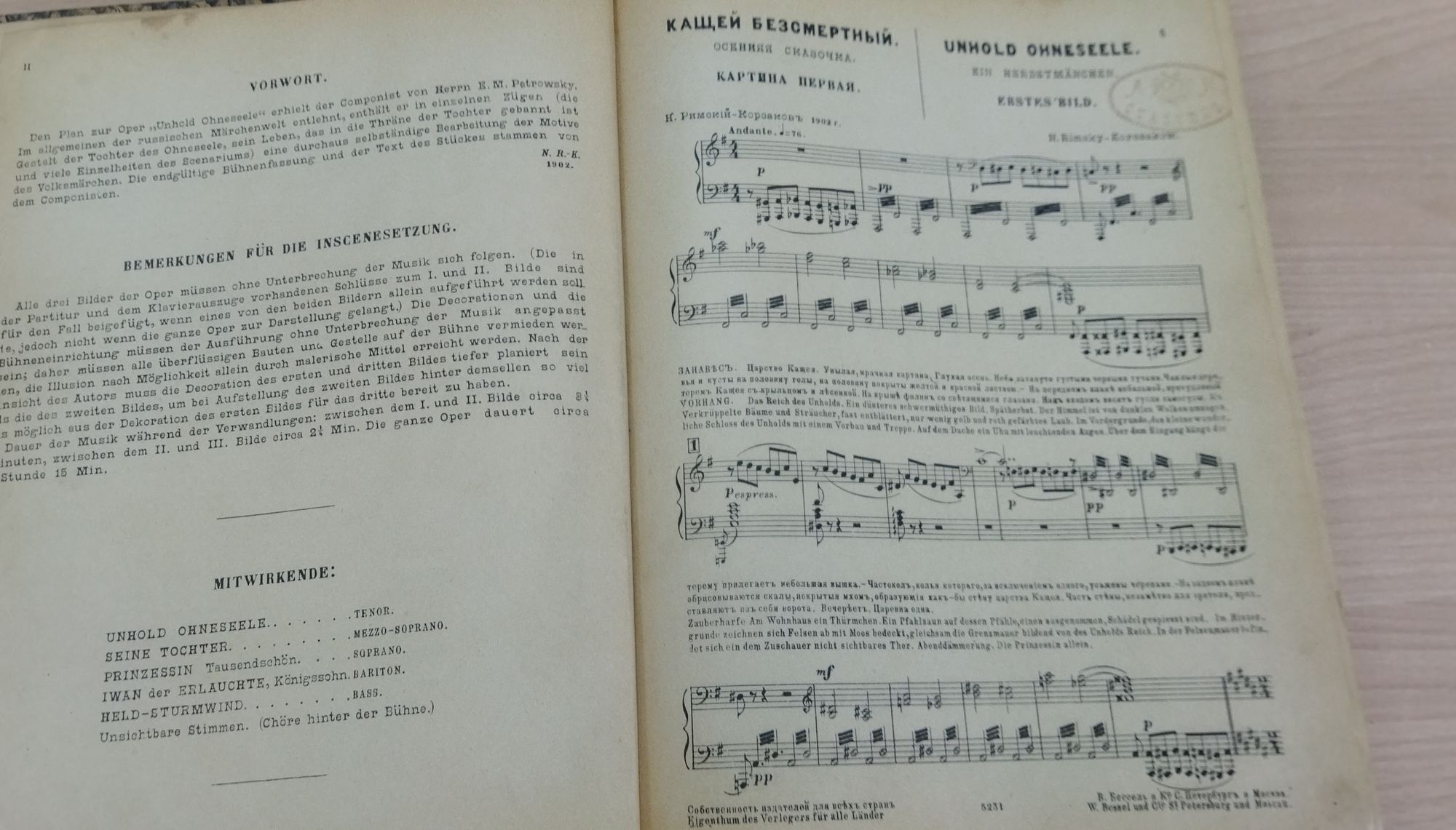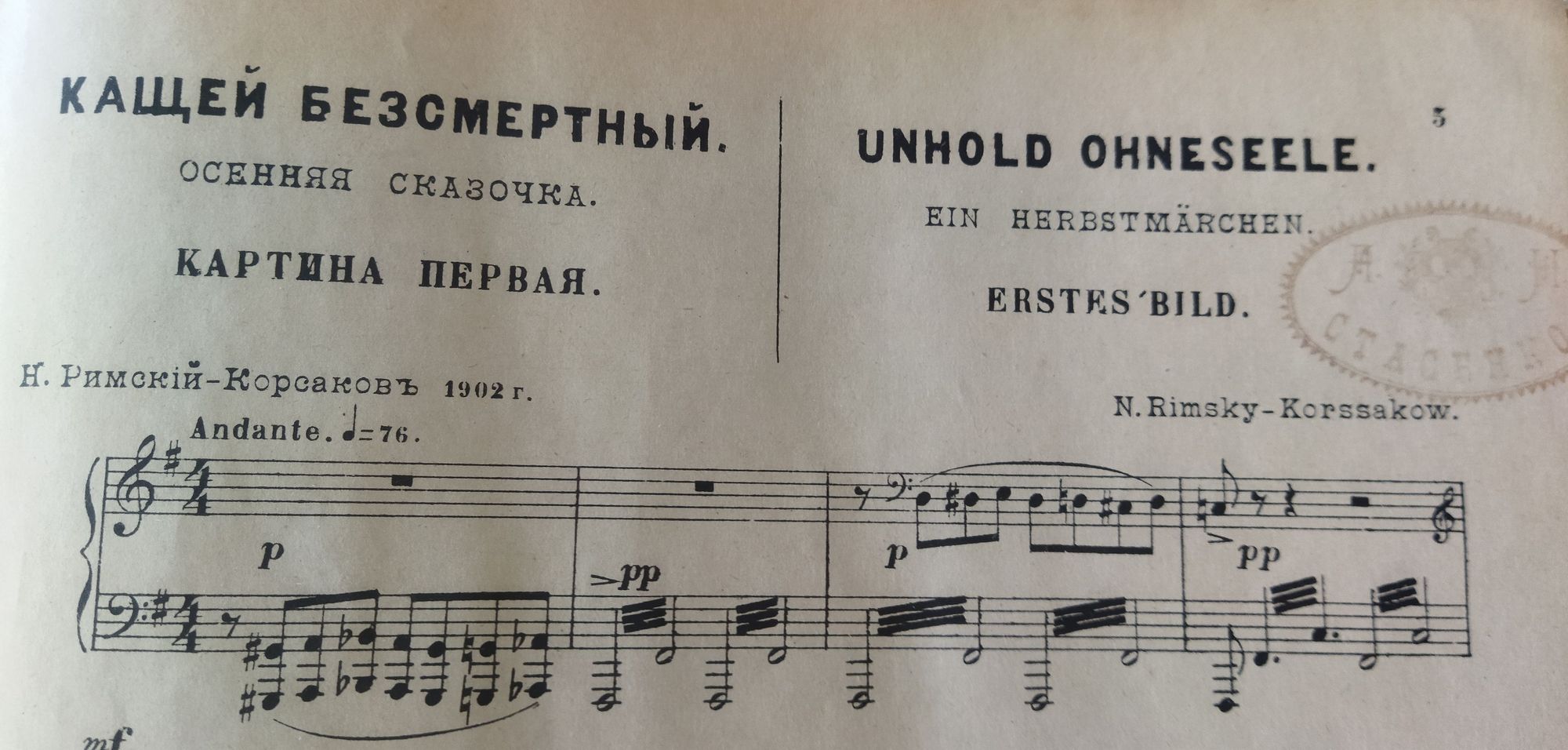 В собрании редких нот фонда сектора литературы по искусству Тульской областной научной библиотеки хранится часть коллекции нот талантливого музыканта и педагога Александра Николаевича Стасенко. Среди них редкое издание оперы Николая Андреевича Римского-Корсакова «Кащей бессмертный», выпущенное в 1916 году издательством В. В. Бесселя «В. Бессель и К̊» на русском и немецком языках.