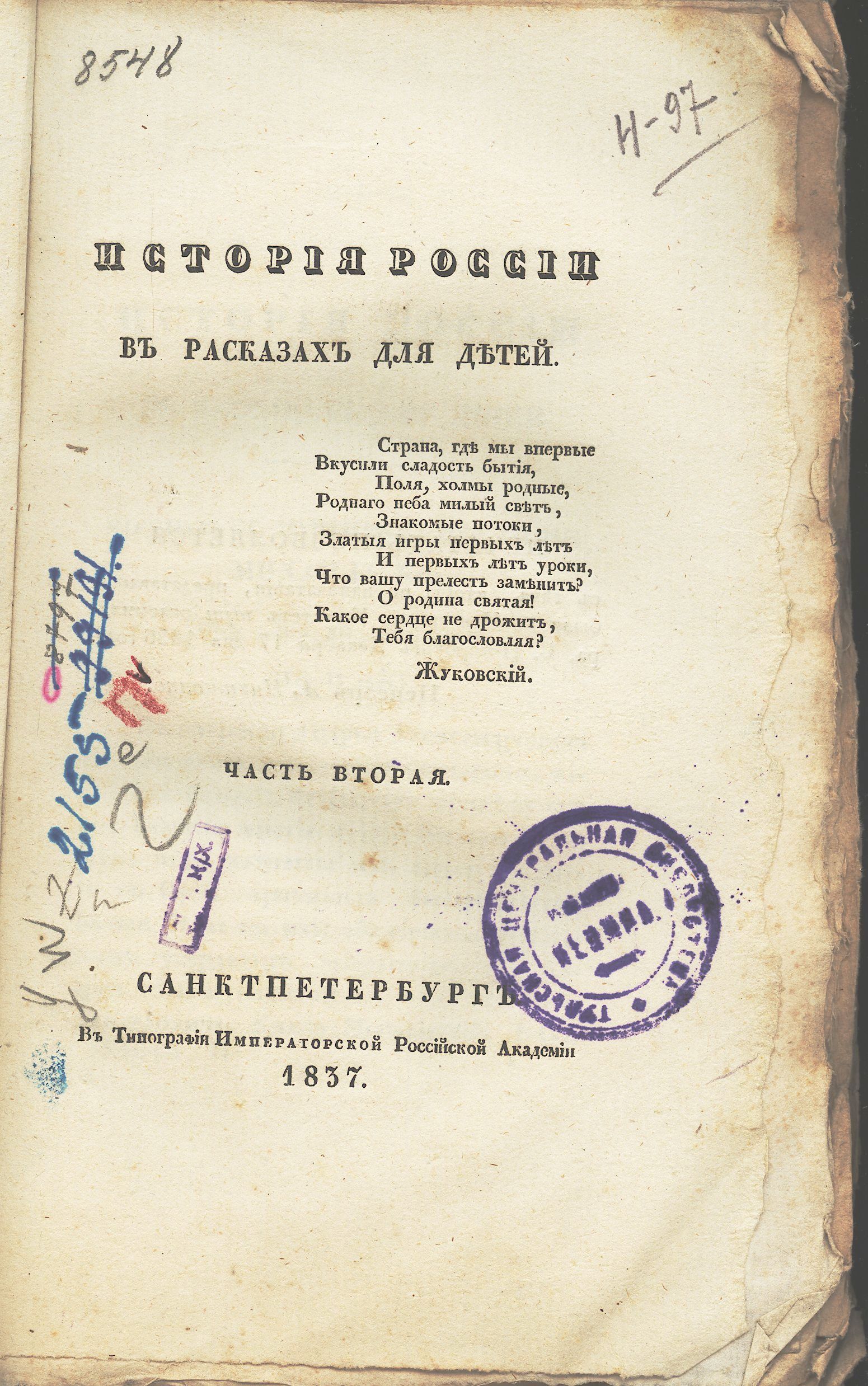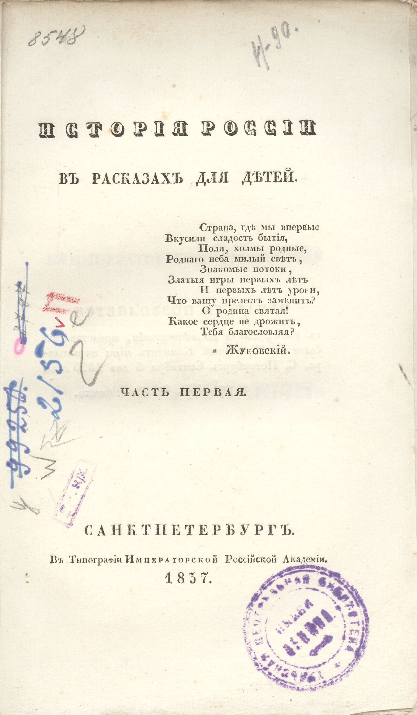 В секторе редкой книги Тульской областной научной библиотеки хранятся первые два тома шеститомника «История России в рассказах для детей», изданные в типографии Императорской Академии наук в 1837 году. В первой части книги автор повествует о ключевых событиях российской истории вплоть до начала XVII в. Вторая часть охватывает период с 1609 г. до восхождения на престол Екатерины Второй (1762 г.).