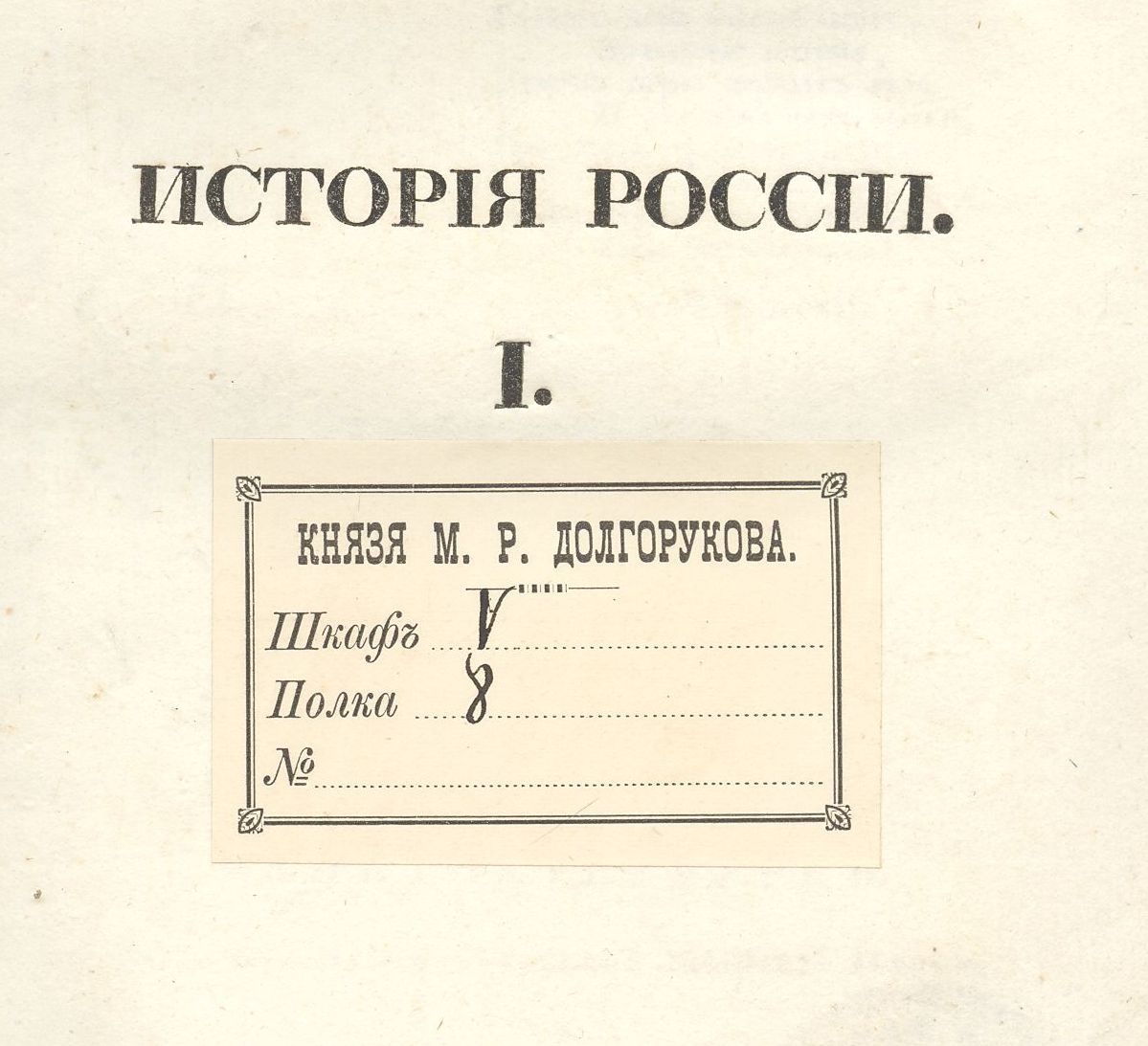 Данные издания некогда принадлежали Михаилу Ростиславовичу Долгорукову – коллежскому советнику, уездному предводителю дворянства Богородицкого уезда Тульской губернии. Об этом свидетельствуют экслибрис-наклейки с надписью: «Князя М. Р. Долгорукова. Шкафъ. Полка. N» на шмуцтитулах.