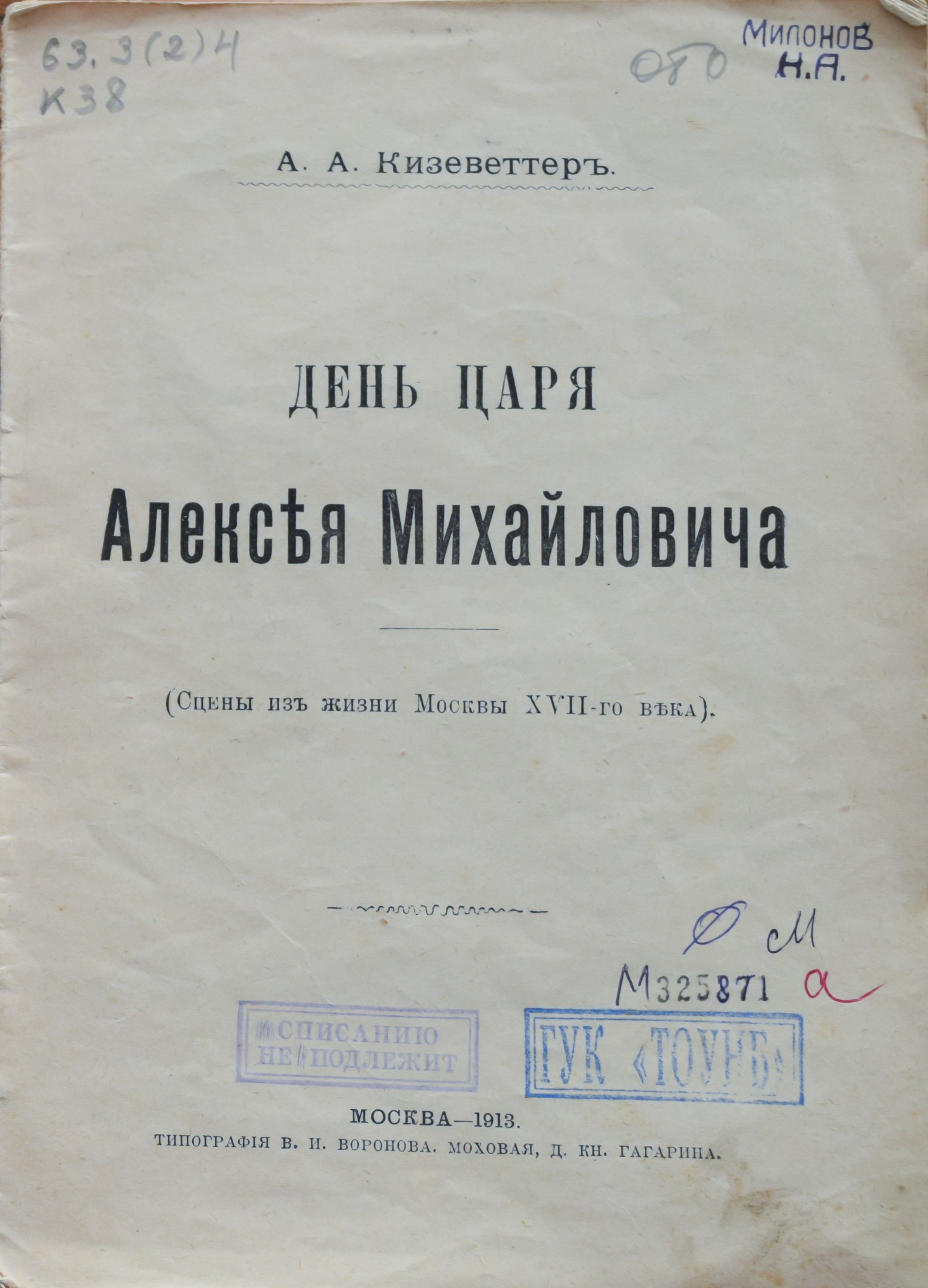 В фонде Тульской областной научной библиотеки хранится исторический очерк «День царя Алексея Михайловича: (Сцены из жизни Москвы XVII-го века)» доктора русской истории, профессора Александра Александровича Кизеветтера (1866-1933), изданный в Москве в 1913 году в типографии В. И. Воронова.