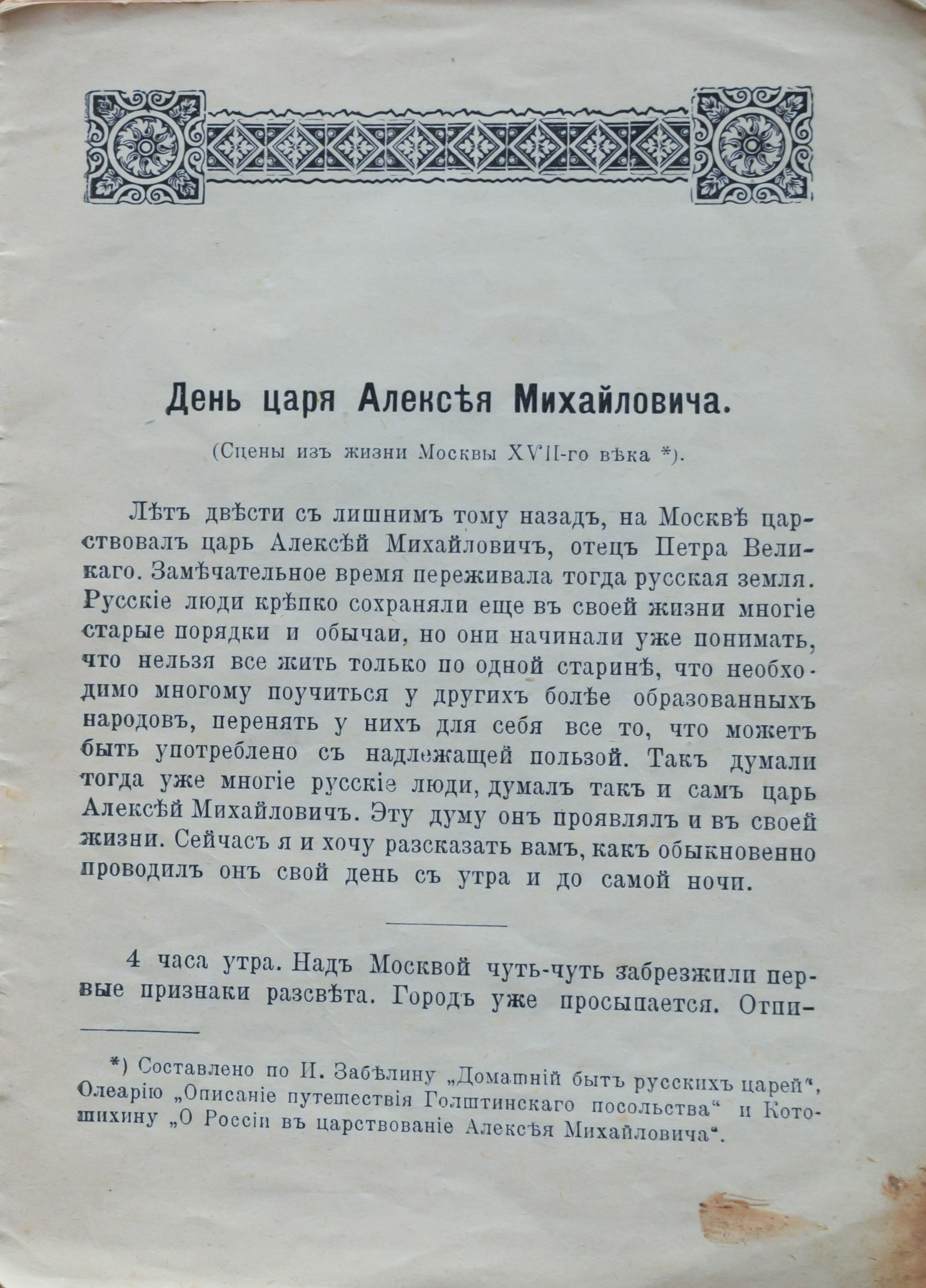 Автор рассказывает, как проводил обычный день царь Алексей Михайлович. В своей монографии он обобщил факты из жизни государя, открытые историками в сороковые и пятидесятые годы XIX века.