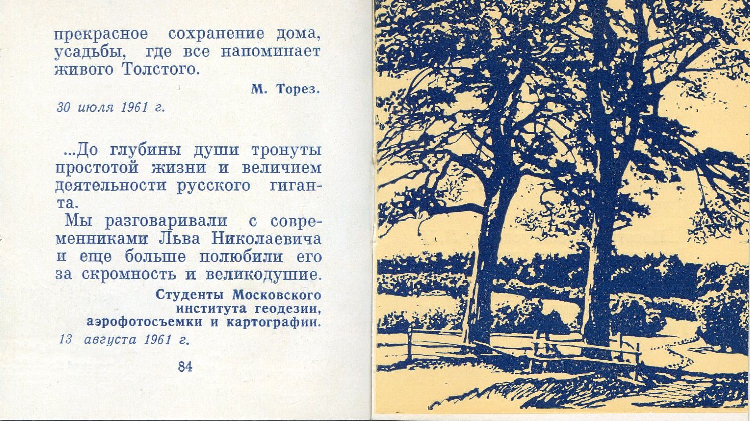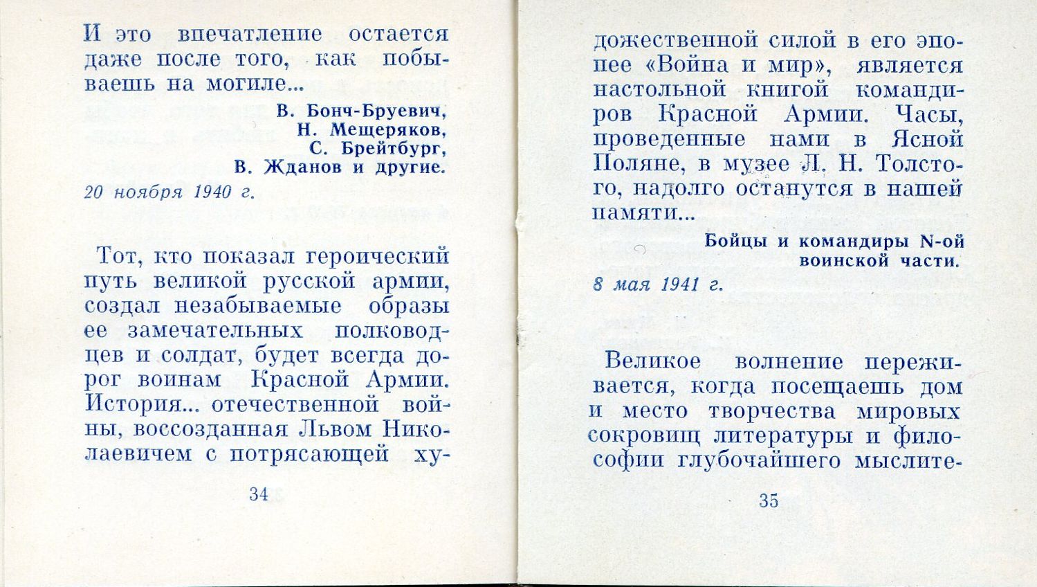 В мае 1944 г. французские летчики авиаполка «Нормандия» посетили Ясную Поляну. Вот что оставили они в книге отзывов: «Французские летчики, посетившие места, где жил великий Толстой, выражают свое восхищение автору «Войны и мира», желают, чтобы по восстановлении мира Франция и Россия научились лучше узнавать друг друга, как пожелал бы этого Толстой» (24 мая 1944 г.)