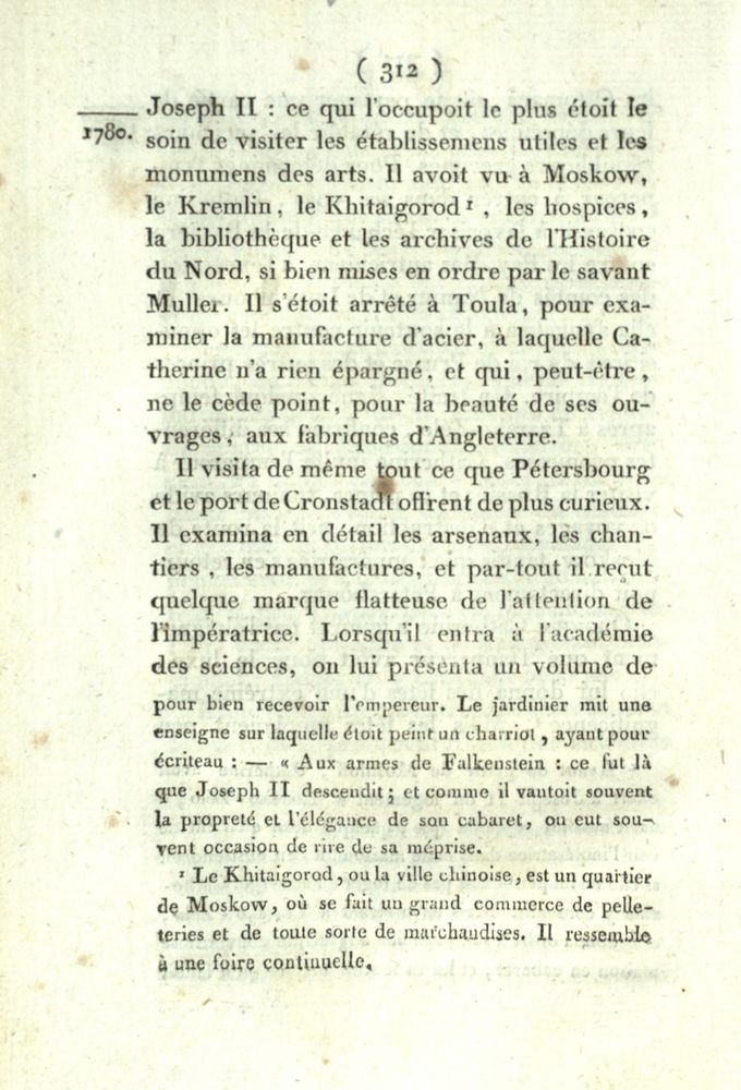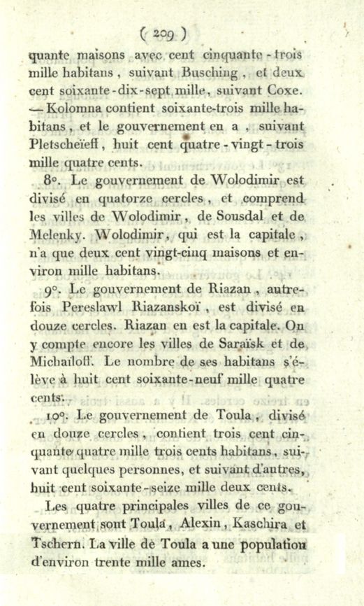 В издании можно встретить сведения о Туле: город располагается на территории большого плато, которое прежде называлось Алаунскими горами; на 1785 г. Россия разделена на наместничества, в центральных наместничествах проживает большая часть населения. Наместничества, такие как: Ярославское, Тульское, Калужское… - не менее населены, чем большие провинции Германии. Тульское наместничество разделено на 12 уездов. Четыре основных города наместничества: Тула, Алексин, Каш ира и Чернь. Город Тула имеет население около тридцати тысяч душ. Казань, Тула, Оренбург поставляют много смальца (жира, вытопленного из сала). Согласно Ж.-А. Кастера, во время своего неофициального визита в Россию в 1780 г. император Священной Римской империи Иосиф II (Joseph II; 1741-1790) останавливался в Туле, чтобы осмотреть сталелитейную мануфактуру, которая не уступала английским образцам.
