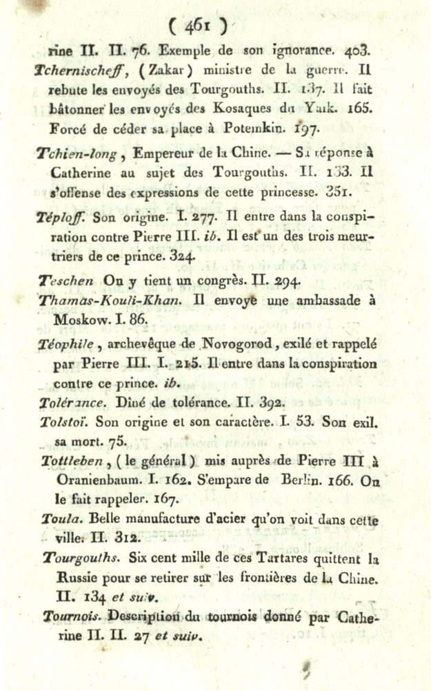 С расцветом эпохи Просвещения в Европе большое внимание уделялось развитию западной политической и интеллектуальной культуры XVIII века, поэтому неслучайным являлся интерес европейцев к царствованию Екатерины II (с 1762 по 1796 год), ознаменованному общественно-политическими и культурными преобразованиями в России. В Секторе литературы на иностранных языках среди трудов, посвящённых отечественной истории, хранится издание из владельческой коллекции князя М. Р. Долгорукова Castéra, J. H. Histoire de Catherine II, impératrice de Russie / par J. Castéra. - A Paris : chez F. Buisson, imprimeur-libraire , An VIII.
