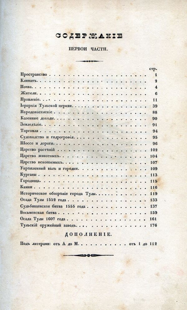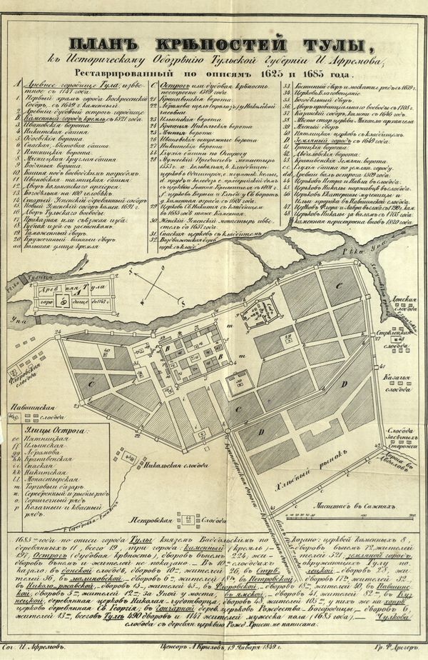 Интерес вызывают представленные в дополнениях карты: карта Тульской губернии, план крепостей Тулы, реставрированный по описям 1625 и 1685 годов, план города Тулы 1741 года с изъяснениями. Помимо карт, в дополнения помещены списки воевод, чиновников, начальников Тульского наместничества и губернии, губернских предводителей дворянства, мастеров, прославивших Тулу своими изделиями, писателей и членов учёных обществ и даже любителей просвещения и библиофилов Тульской губернии.