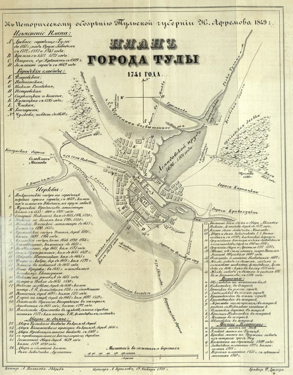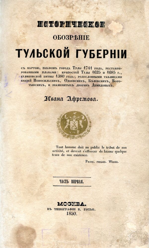 Монография по истории Тульского края «Историческое обозрение Тульской губернии» была издана в Москве в 1850 году в типографии В. Готье. Её автор – Иван Фёдорович Афремов, уроженец Тульской губернии, потомственный дворянин, посвятил свою работу «дражайшей Родине, благородному дворянству, почтенному купечеству и согражданам Тульской губернии». Публикация труда принесла его создателю славу «первого историка Тульского края».