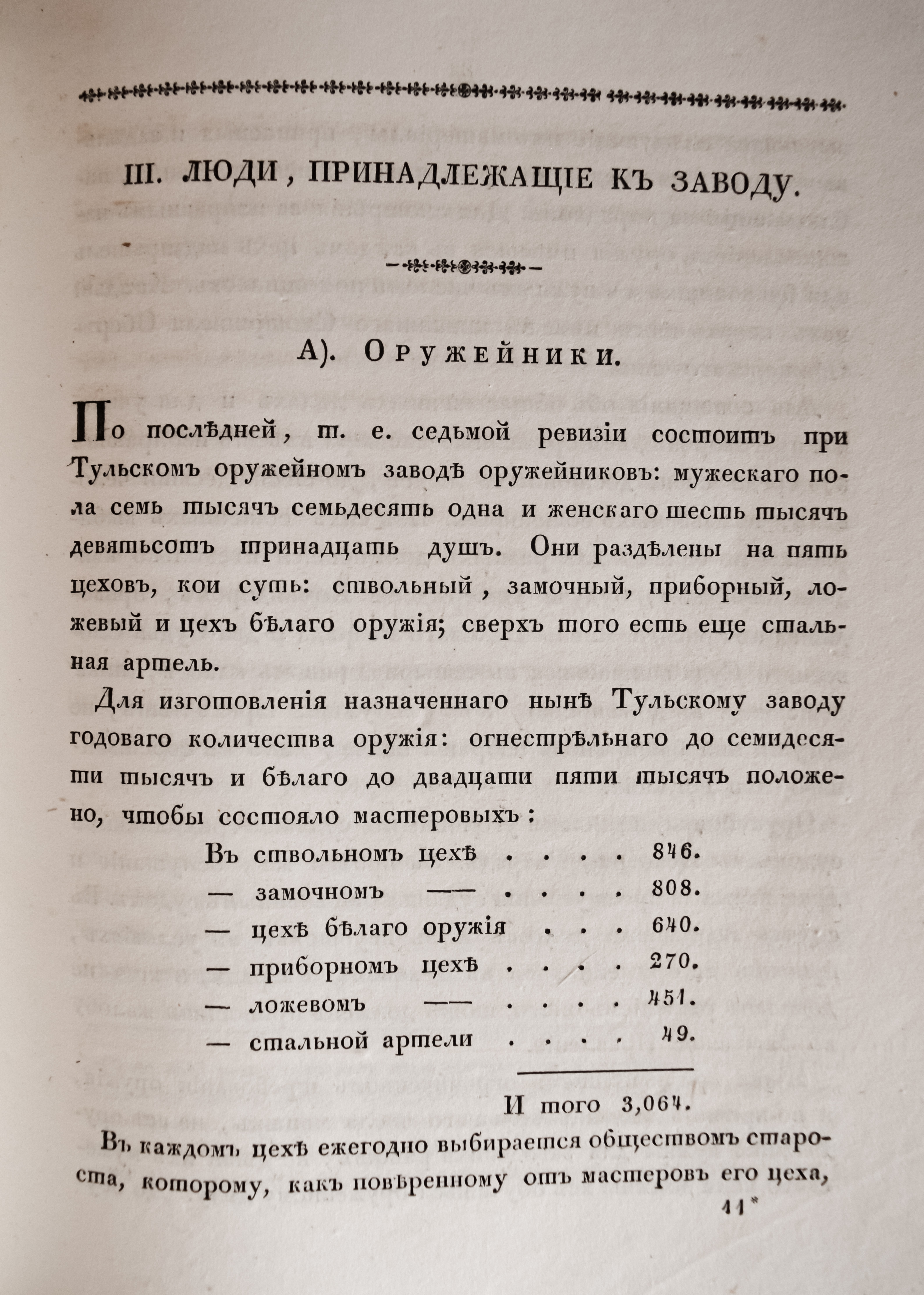 И.Х. Гамель нашёл интересные факты об истории тульского завода, которые позволили автору подробно рассмотреть заводские строения, а также перечислить производимые в них работы. Так, в главе «Люди, принадлежащие к заводу» Гамель определил количество трудящихся мужчин и женщин, мастеровых, обозначил вопросы, касающиеся уклада жизни оружейников и приписанных крестьян.