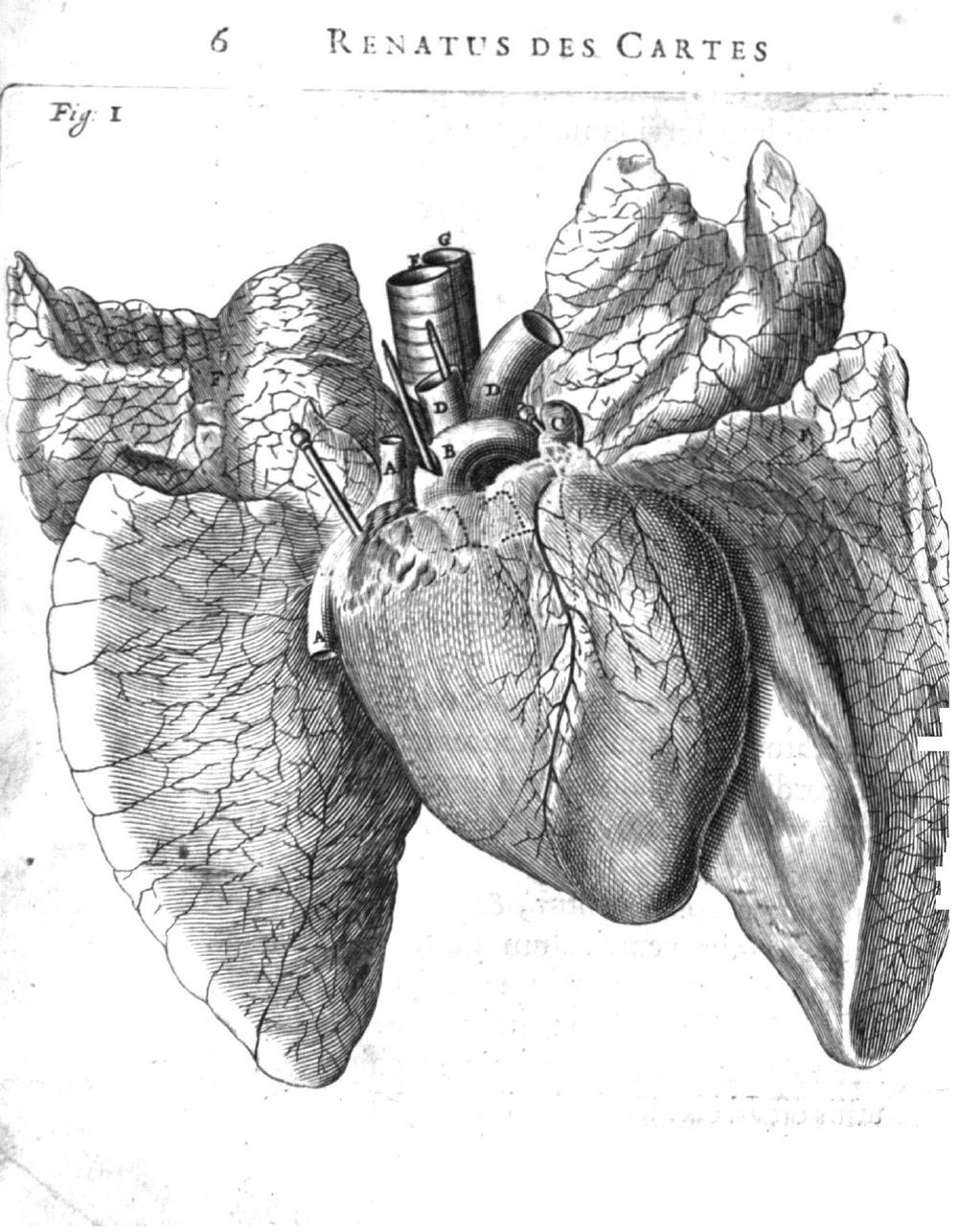 Издание De homine figuris (Lugduni Batavorum [Leiden], 1664) – это трактат Декарта о строении и функциях человеческого тела, где каждая система – это действующий механизм, приводящий тело в движение. Книга включает подробные чёрно-белые рисунки и объёмную иллюстрацию, демонстрирующую строение сердца человека.
