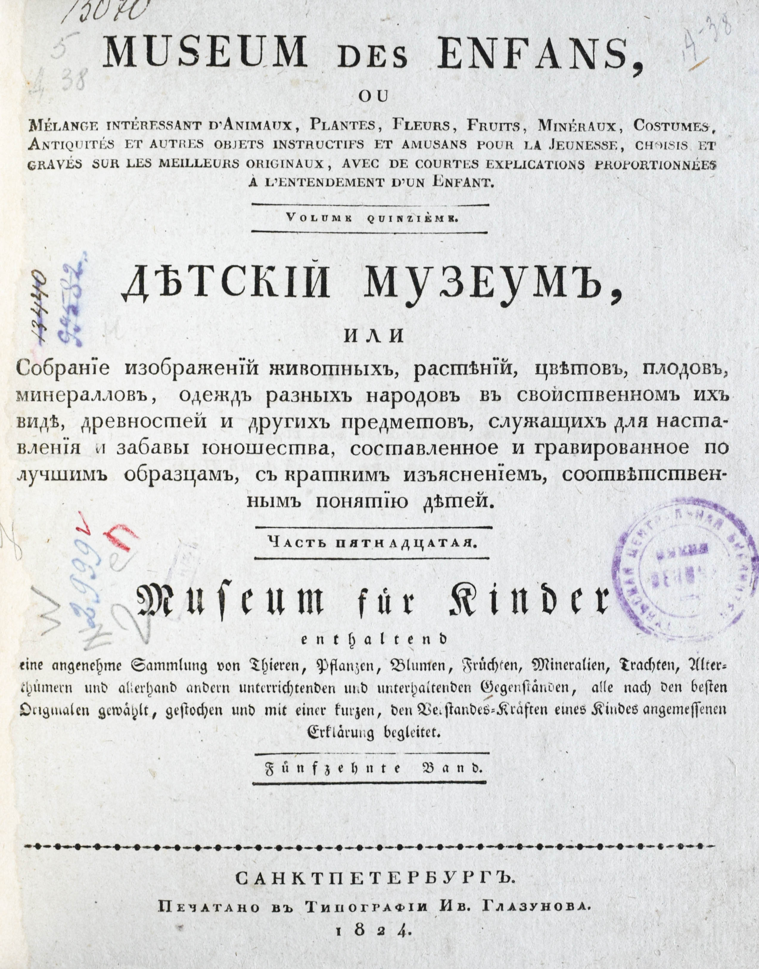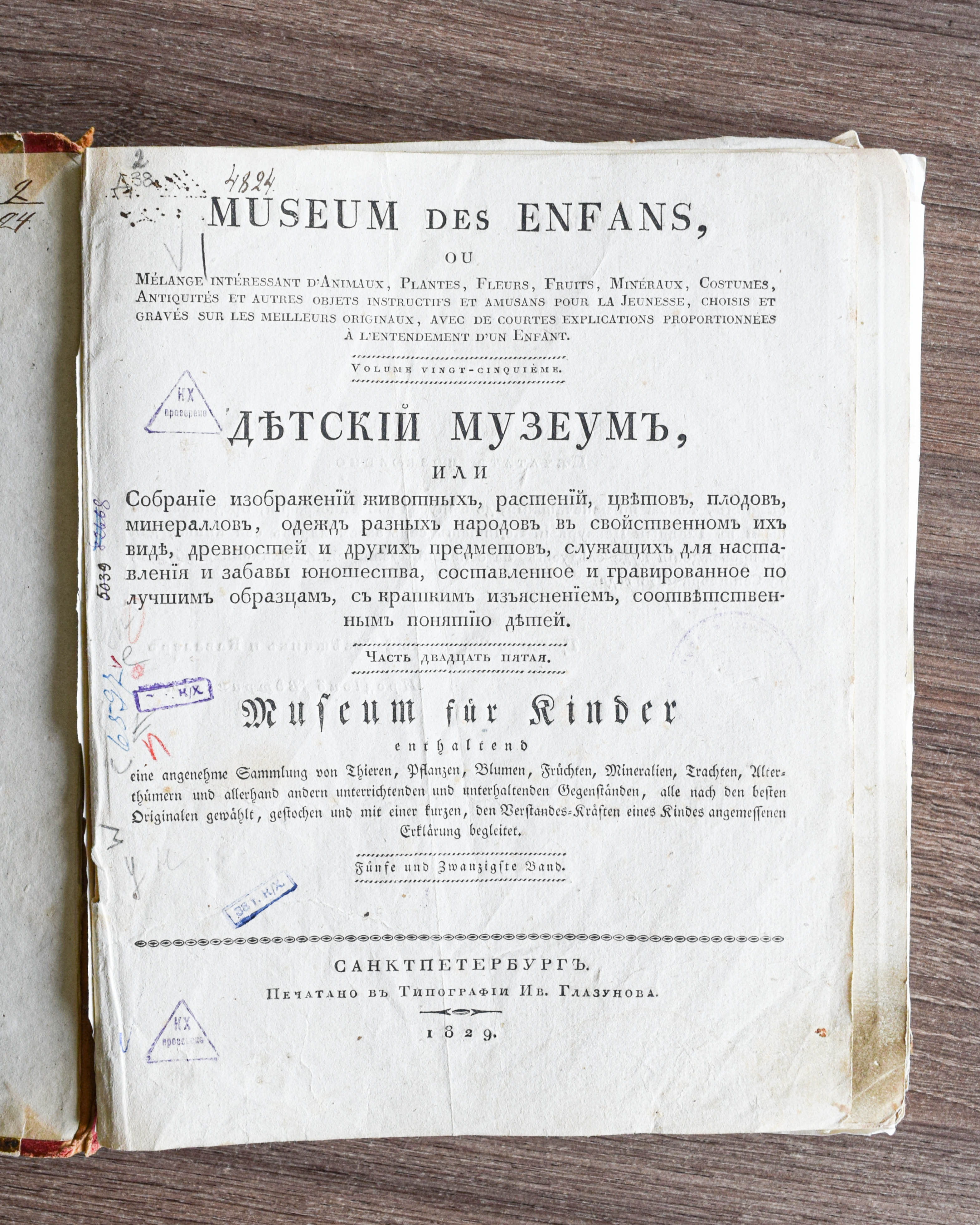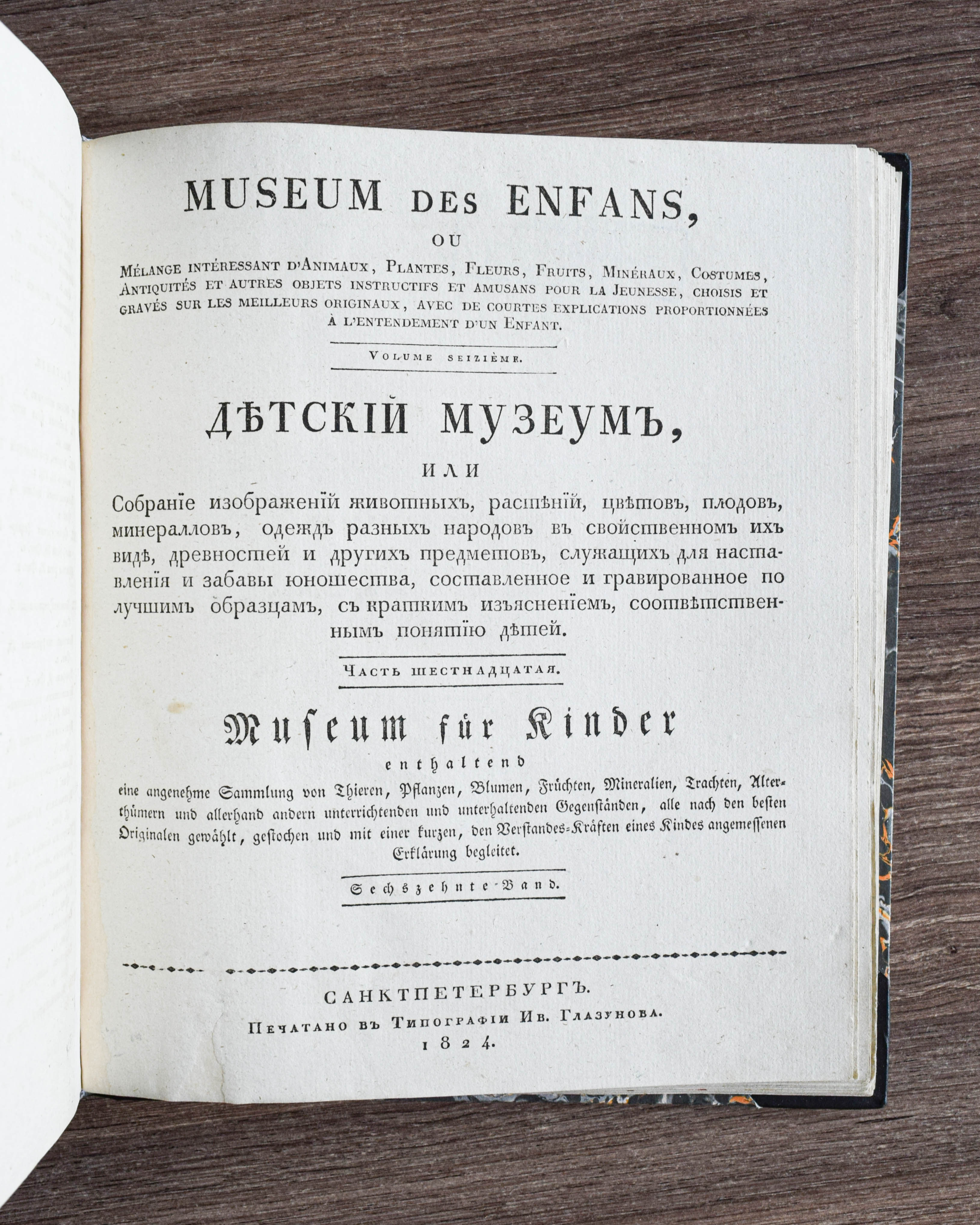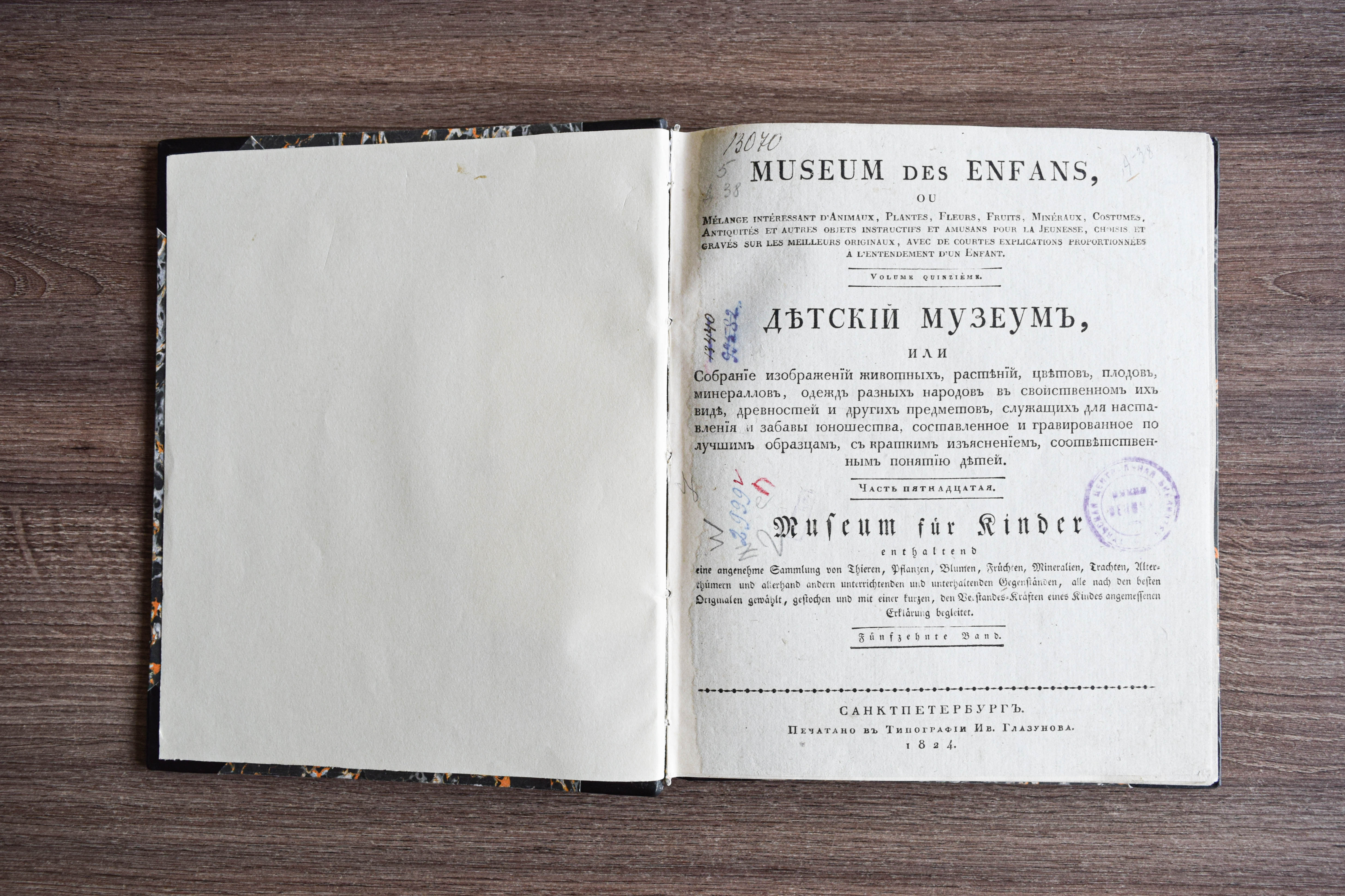 Первая половина XIX века ознаменована появлением журналов для детей. В их число входил «Детский музеум». Полное заглавие книги отражает его тематическую направленность: «Детский музеум, или Собрание изображений животных, растений, цветов, плодов, минералов, одежд разных народов в свойственном их виде, древностей и других предметов, служащих для наставления и забавы юношества, составленное и гравированное по лучшим образцам, с кратким изъяснением, соответственным понятию детей». В фонде сектора редкой книги хранятся два экземпляра 1824 и 1829 гг., напечатанные в типографии Ивана Петровича Глазунова в Санкт-Петербурге. В одном томе сплетены части 15 и 16, в другом – части 25 и 26.