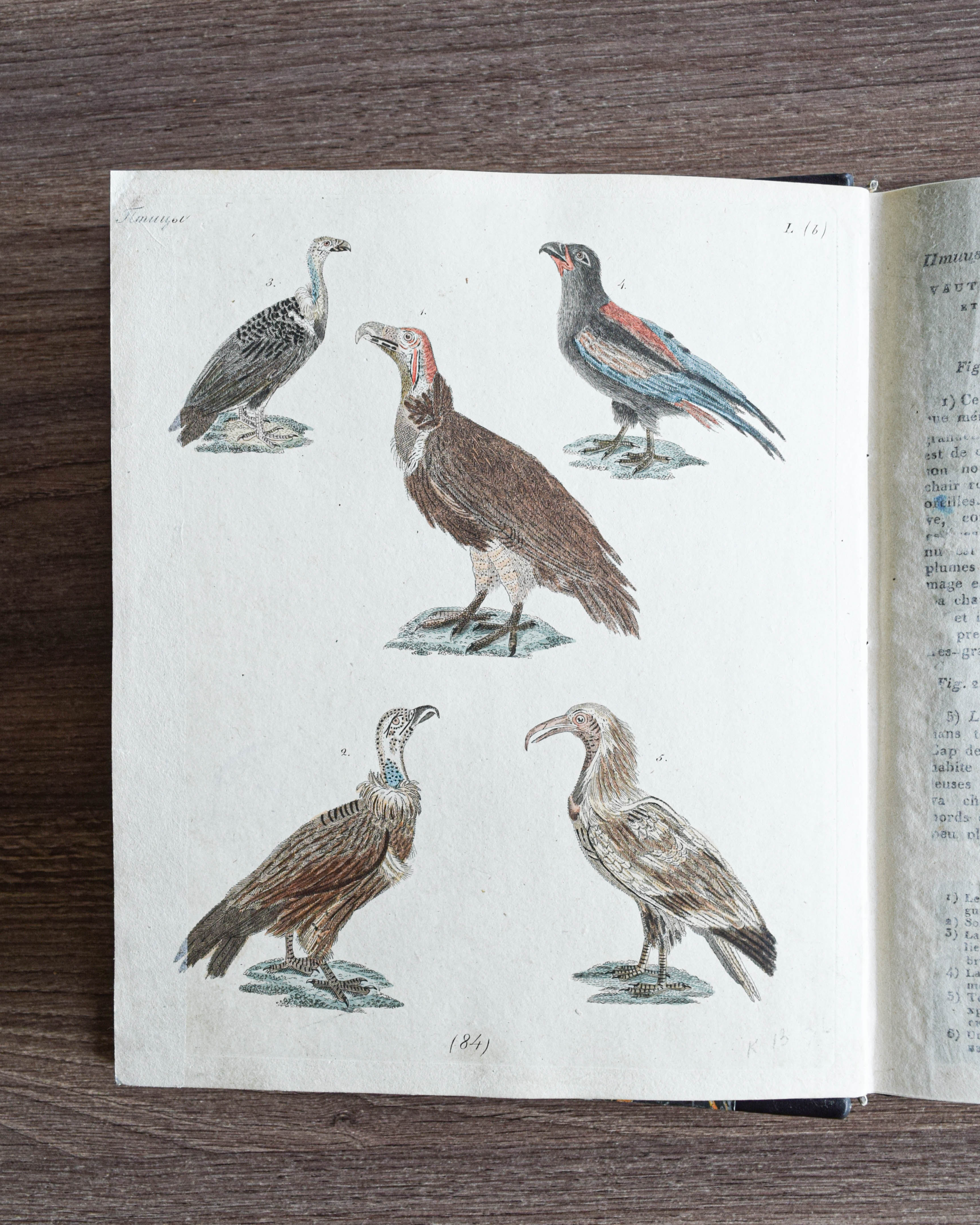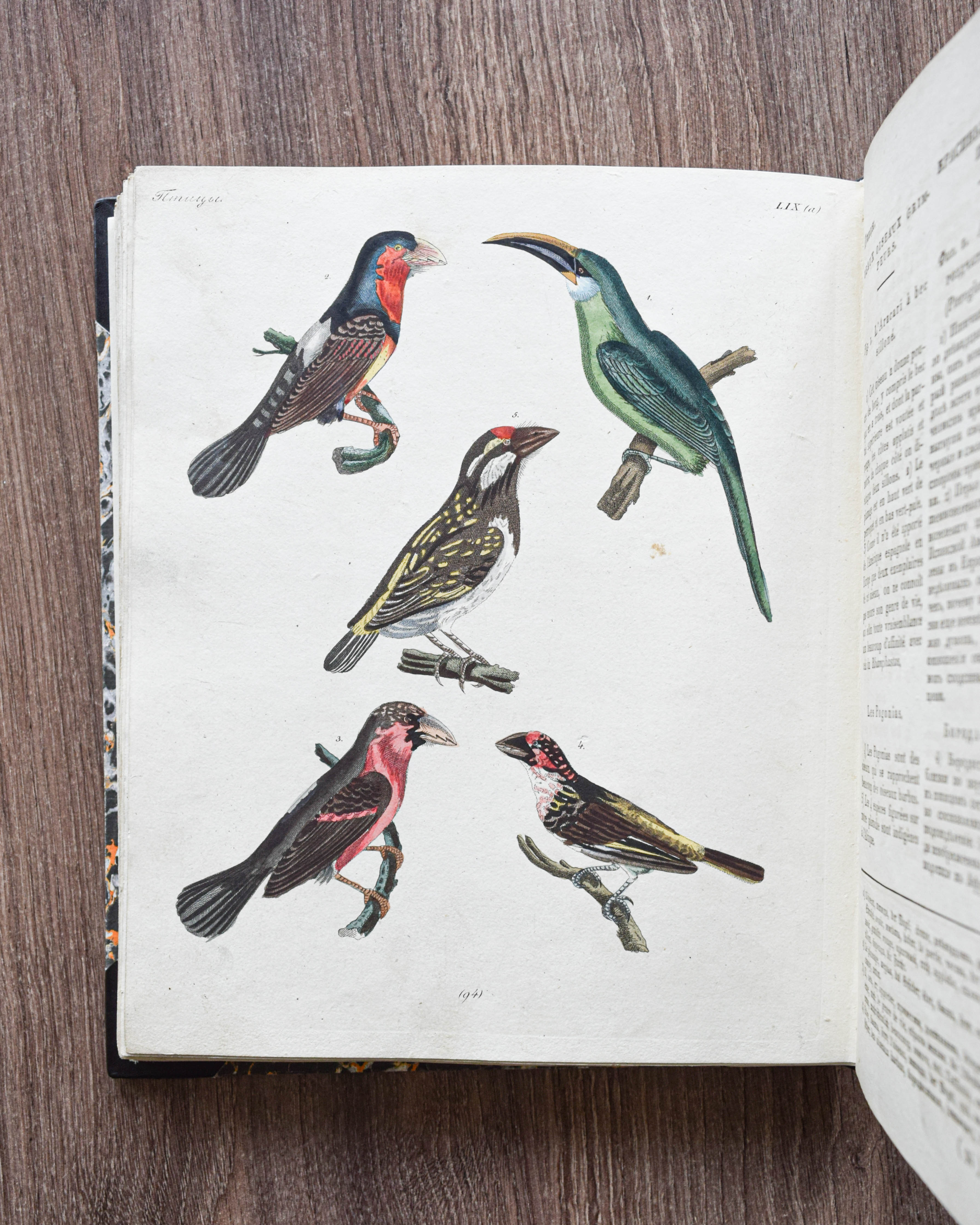Значительную часть иллюстраций на страницах «Музеума» составляют изображения птиц, которые относятся к различным подклассам и подтипам: пищухи (багряная пищуха), красивые цепконогие птицы (аракари с бороздчатым носом), достопримечательные поползки (турако, или венценосец) и др. В некоторых случаях принципом деления выступает среда обитания: африканские и азиатские коршуны (шогун), африканские птицы (белый сокол), редкие немецкие птицы (итальянский зуек).