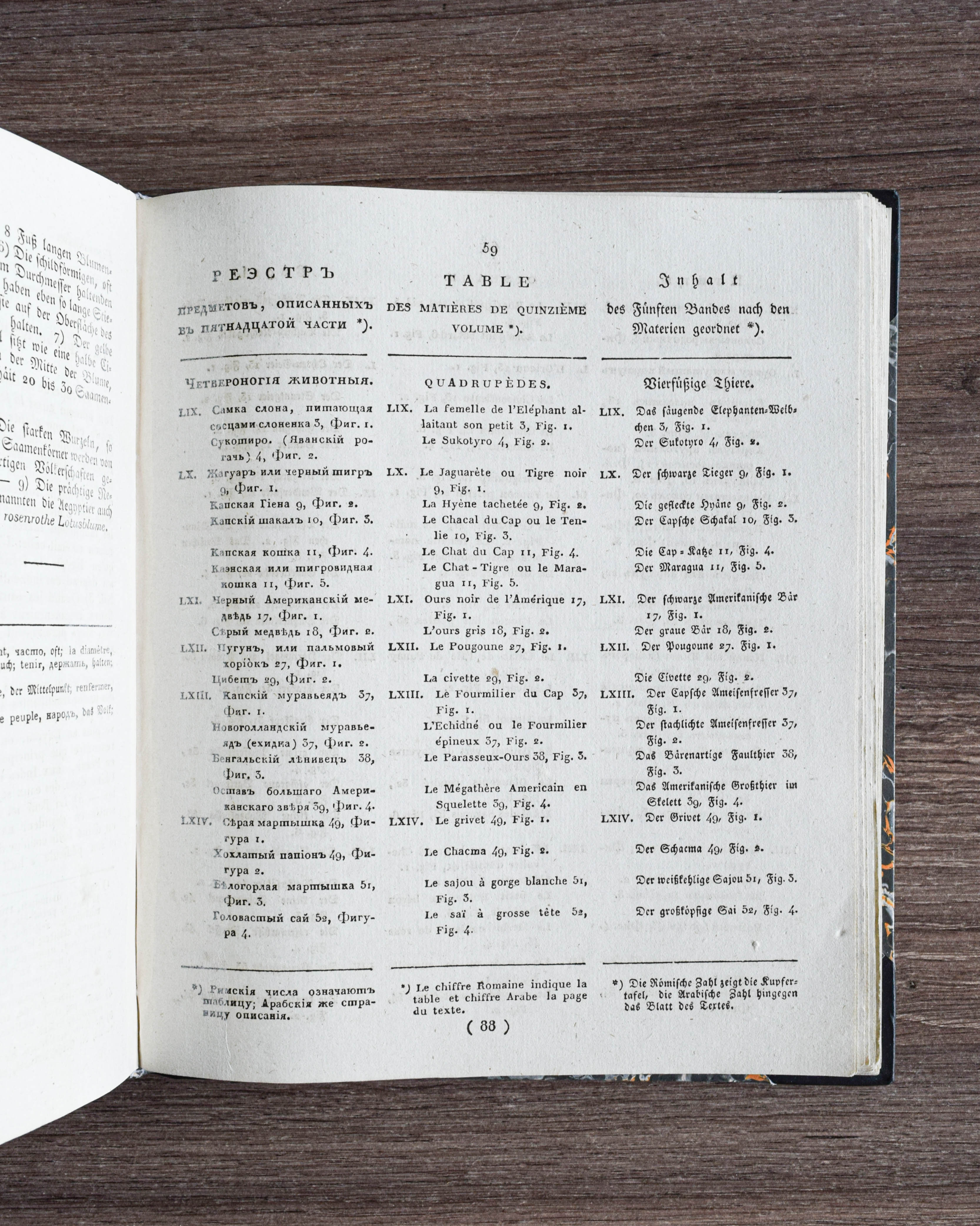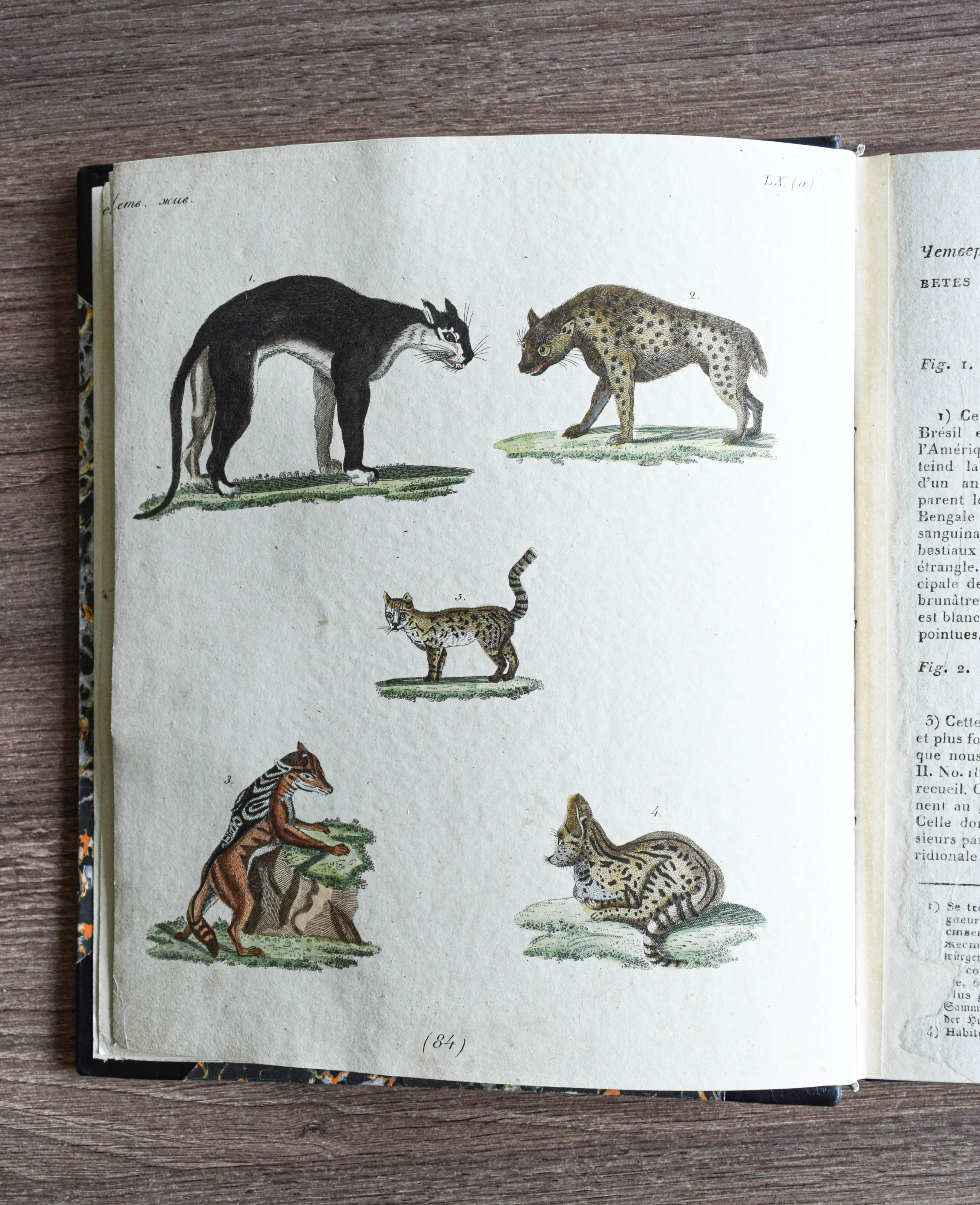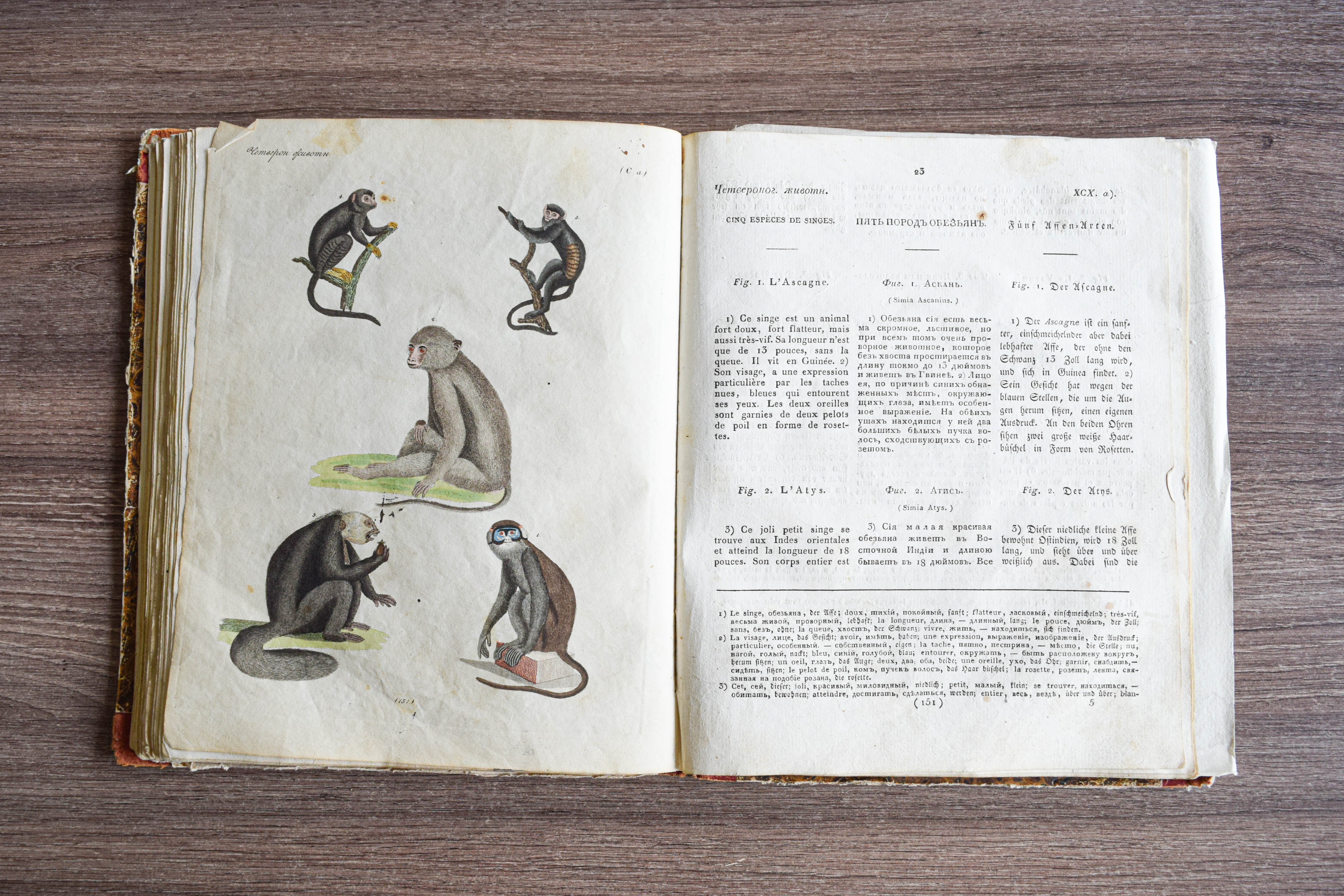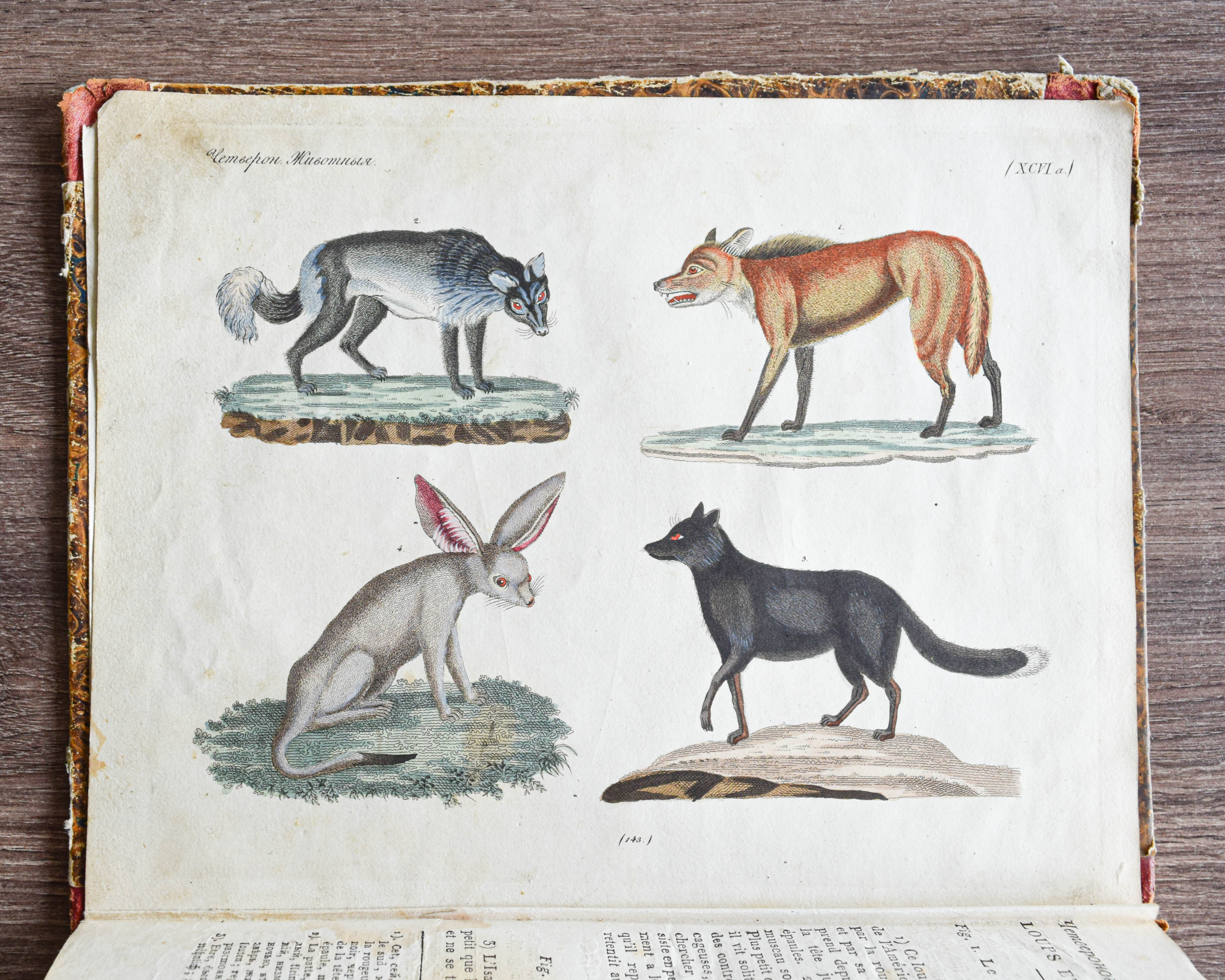 В книгах приведены описания животных, которые известны сейчас, но выглядят иначе, чем раньше. Так, одним из них является фенек. Как мы знаем, это животное, похожее на маленькую лисицу с длинными ушами, обитает в пустынях Северной Африки. В издании изображен похожий представитель данного вида серого цвета – арабский фенек: «Сие небольшое весьма достопримечательное животное причисляется к роду собак, но гораздо более сходствует с лемурами, если не составляет совершенно особенной породы».